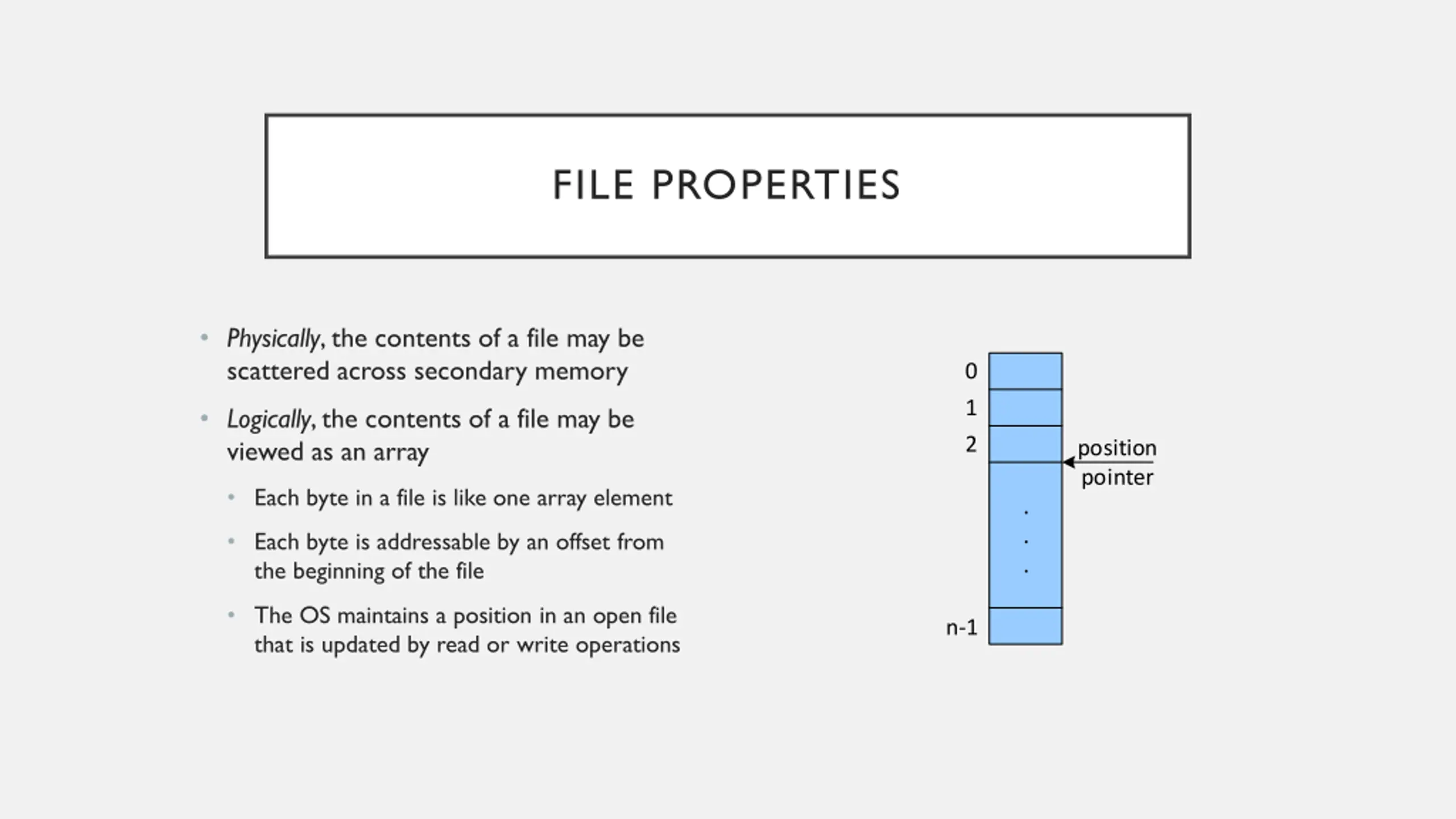FILE PROPERTIES Physically, the contents of a file may be scattered across secondary memory 0 1 2 Logically, the contents of a file may be viewed as an array position pointer Each byte in a file is like one array element . . . Each byte is addressable by an offset from the beginning of the file The OS maintains a position in an open file that is updated by read or write operations n-1