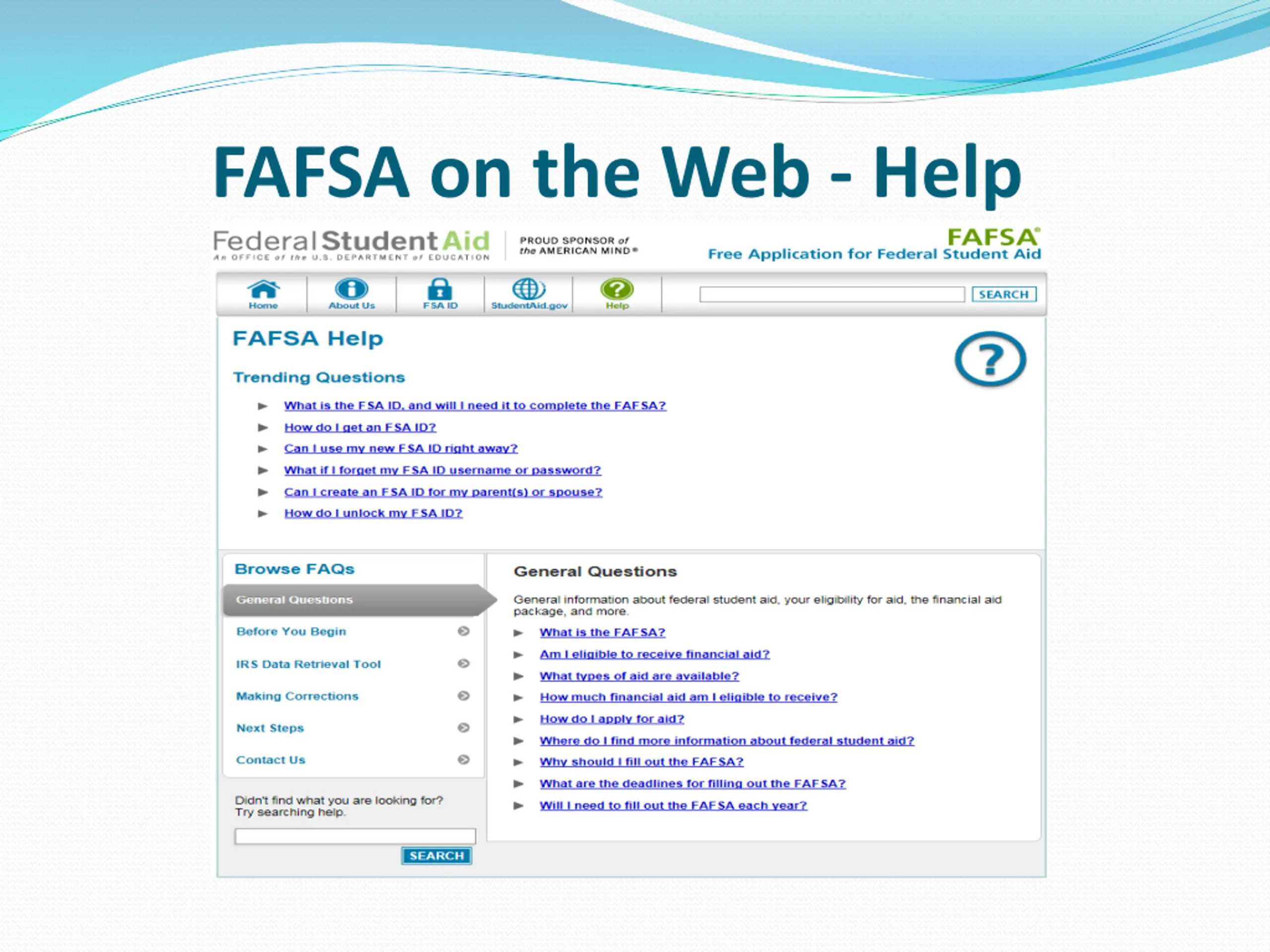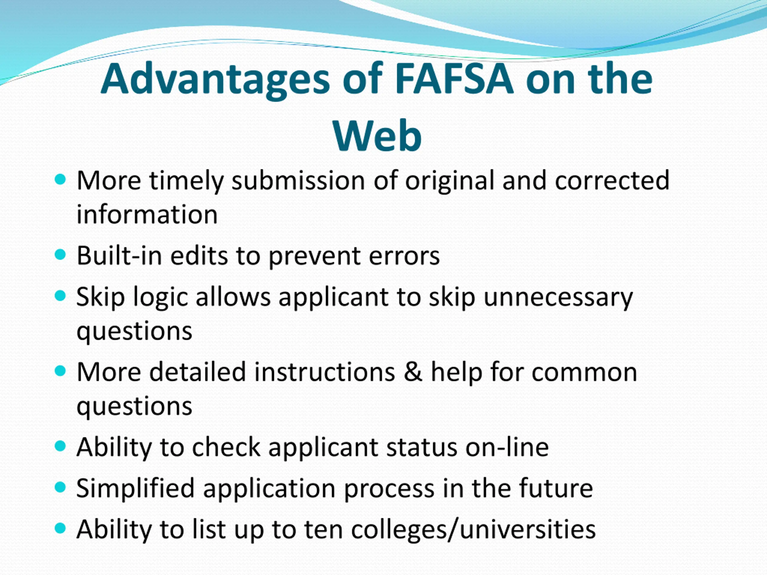 Advantages of FAFSA on the Web More timely submission of original and corrected information Built-in edits to prevent errors Skip logic allows applicant to skip unnecessary questions More detailed instructions & help for common questions Ability to check applicant status on-line Simplified application process in the future Ability to list up to ten colleges/universities