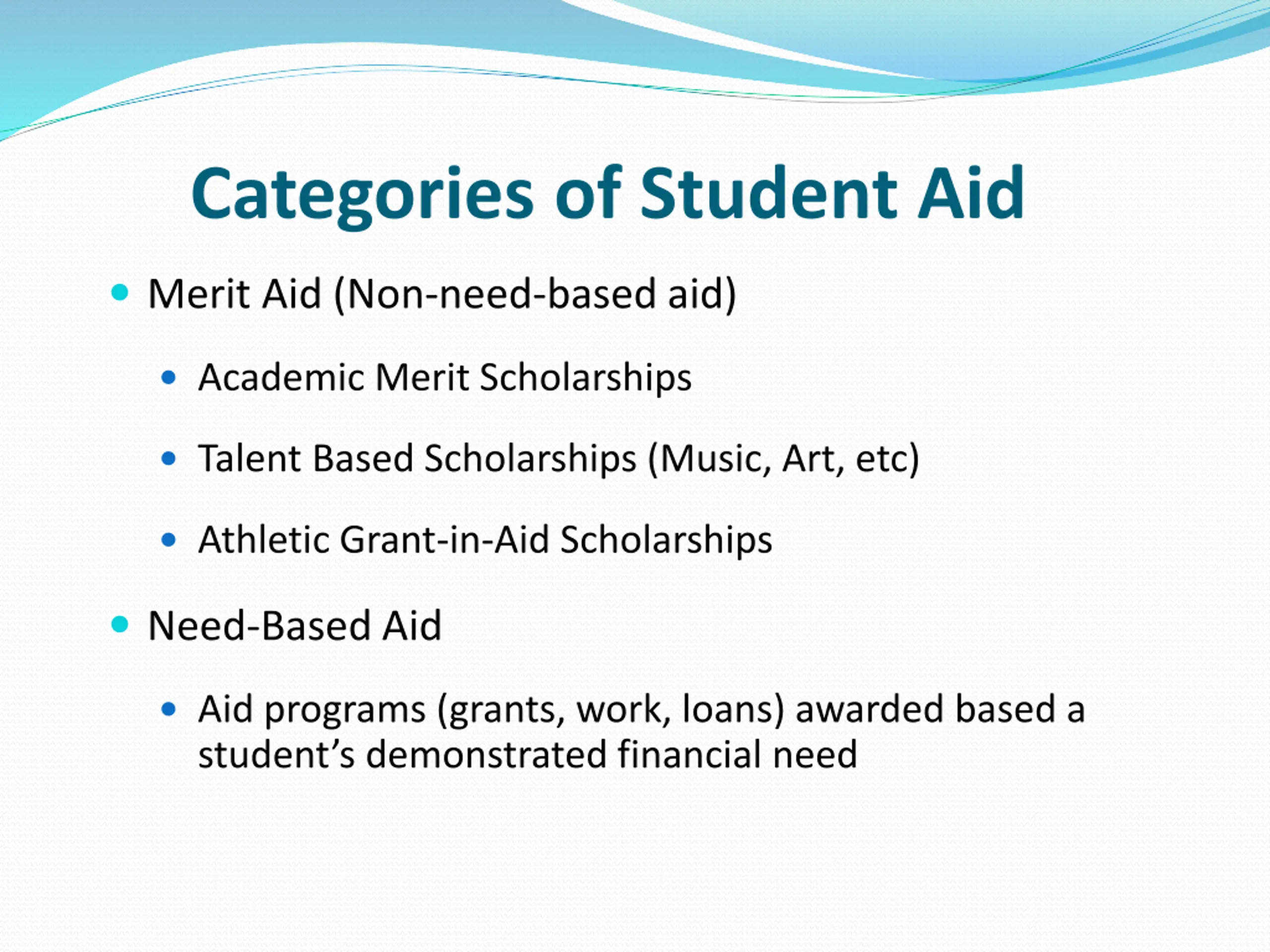 Categories of Student Aid Merit Aid (Non-need-based aid) Academic Merit Scholarships Talent Based Scholarships (Music, Art, etc) Athletic Grant-in-Aid Scholarships Need-Based Aid Aid programs (grants, work, loans) awarded based a student s demonstrated financial need