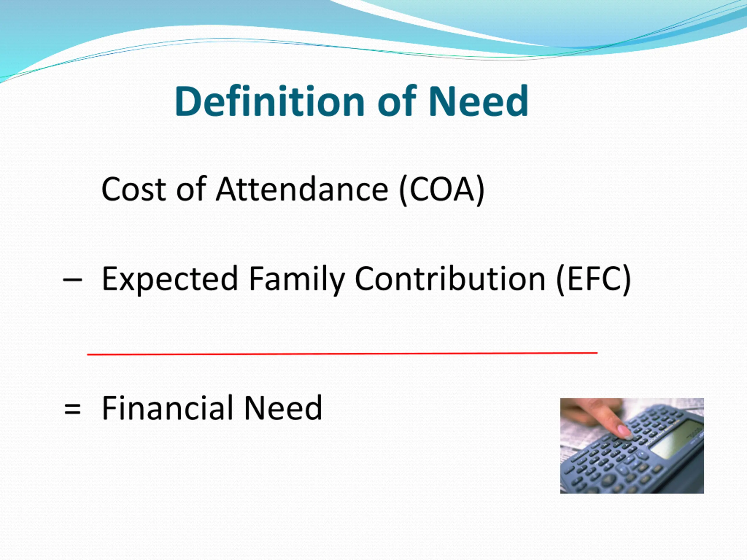 Definition of Need Cost of Attendance (COA) Expected Family Contribution (EFC) = Financial Need