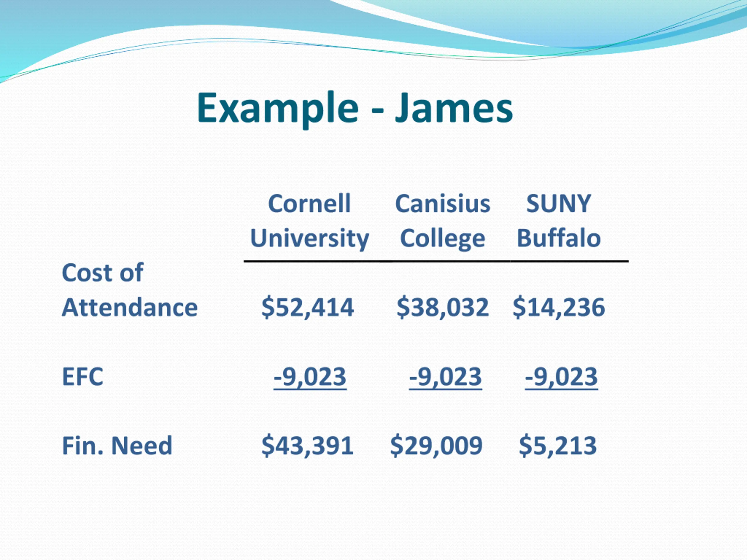 Example - James Cost of Attendance EFC Fin. Need Cornell University $52,414 Canisius College $38,032 -9,023 $29,009 SUNY Buffalo $14,236 -9,023 -9,023 $5,213 $43,391