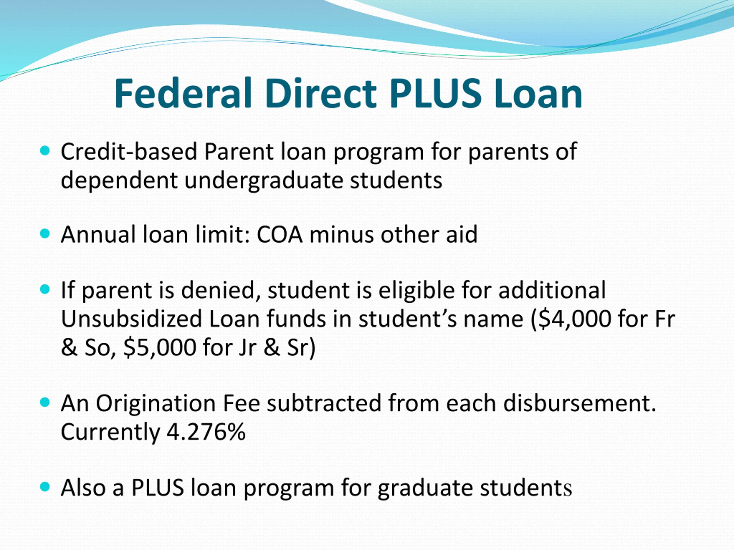 Federal Direct PLUS Loan Credit-based Parent loan program for parents of dependent undergraduate students Annual loan limit: COA minus other aid If parent is denied, student is eligible for additional Unsubsidized Loan funds in student s name ($4,000 for Fr & So, $5,000 for Jr & Sr) An Origination Fee subtracted from each disbursement. Currently 4.276% Also a PLUS loan program for graduate students