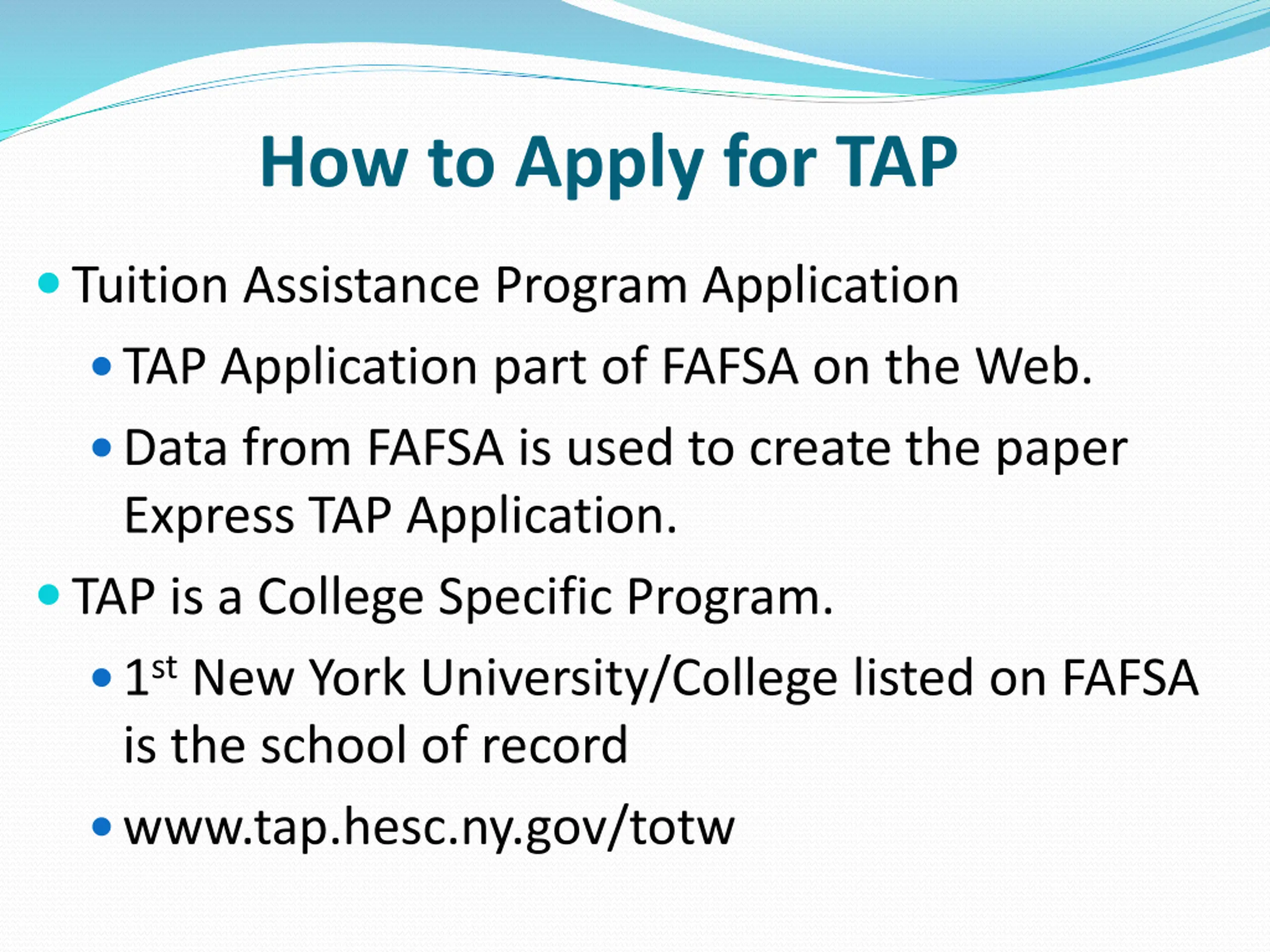 How to Apply for TAP Tuition Assistance Program Application TAP Application part of FAFSA on the Web. Data from FAFSA is used to create the paper Express TAP Application. TAP is a College Specific Program. 1st New York University/College listed on FAFSA is the school of record www.tap.hesc.ny.gov/totw