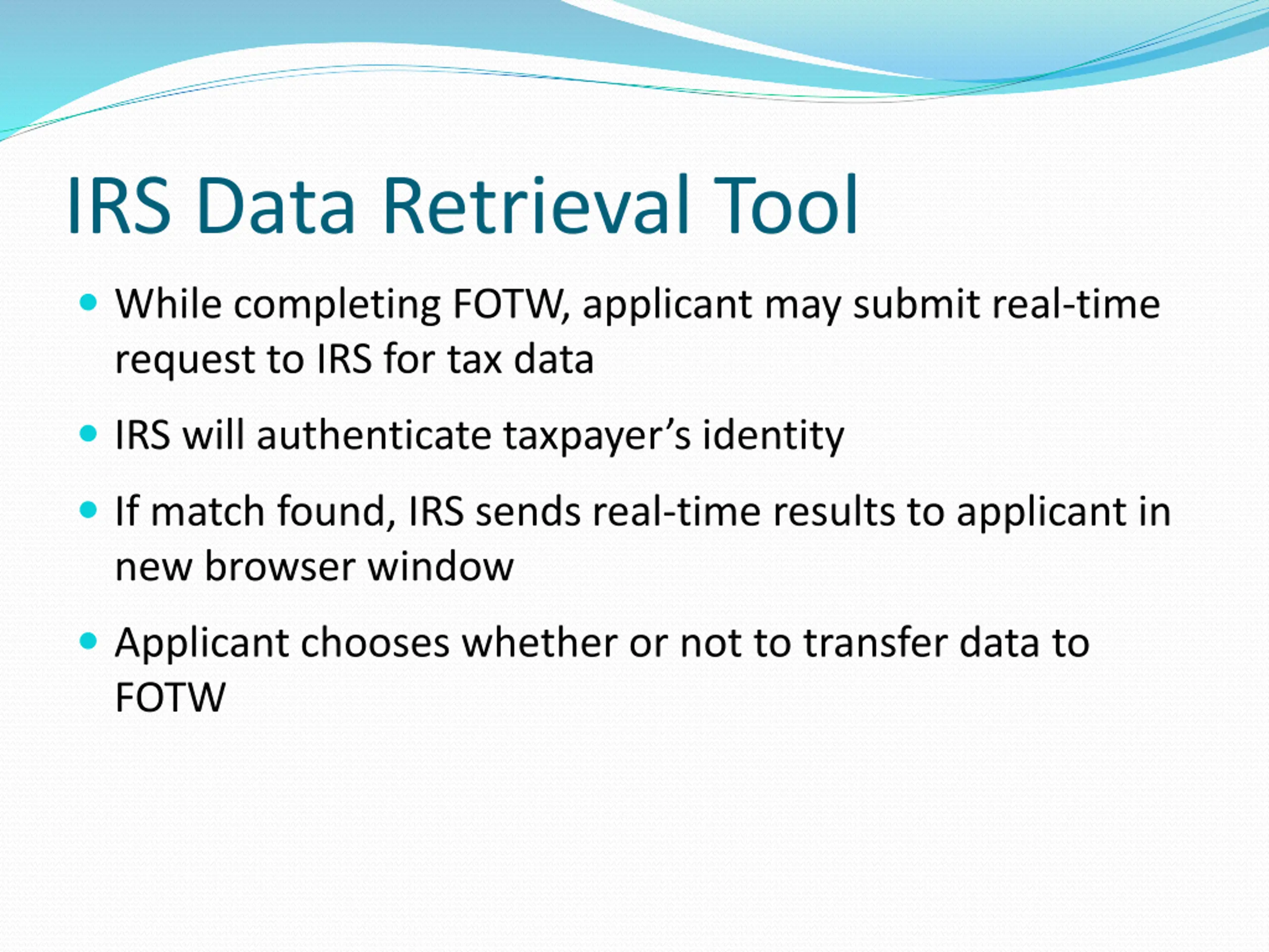 IRS Data Retrieval Tool While completing FOTW, applicant may submit real-time request to IRS for tax data IRS will authenticate taxpayer s identity If match found, IRS sends real-time results to applicant in new browser window Applicant chooses whether or not to transfer data to FOTW
