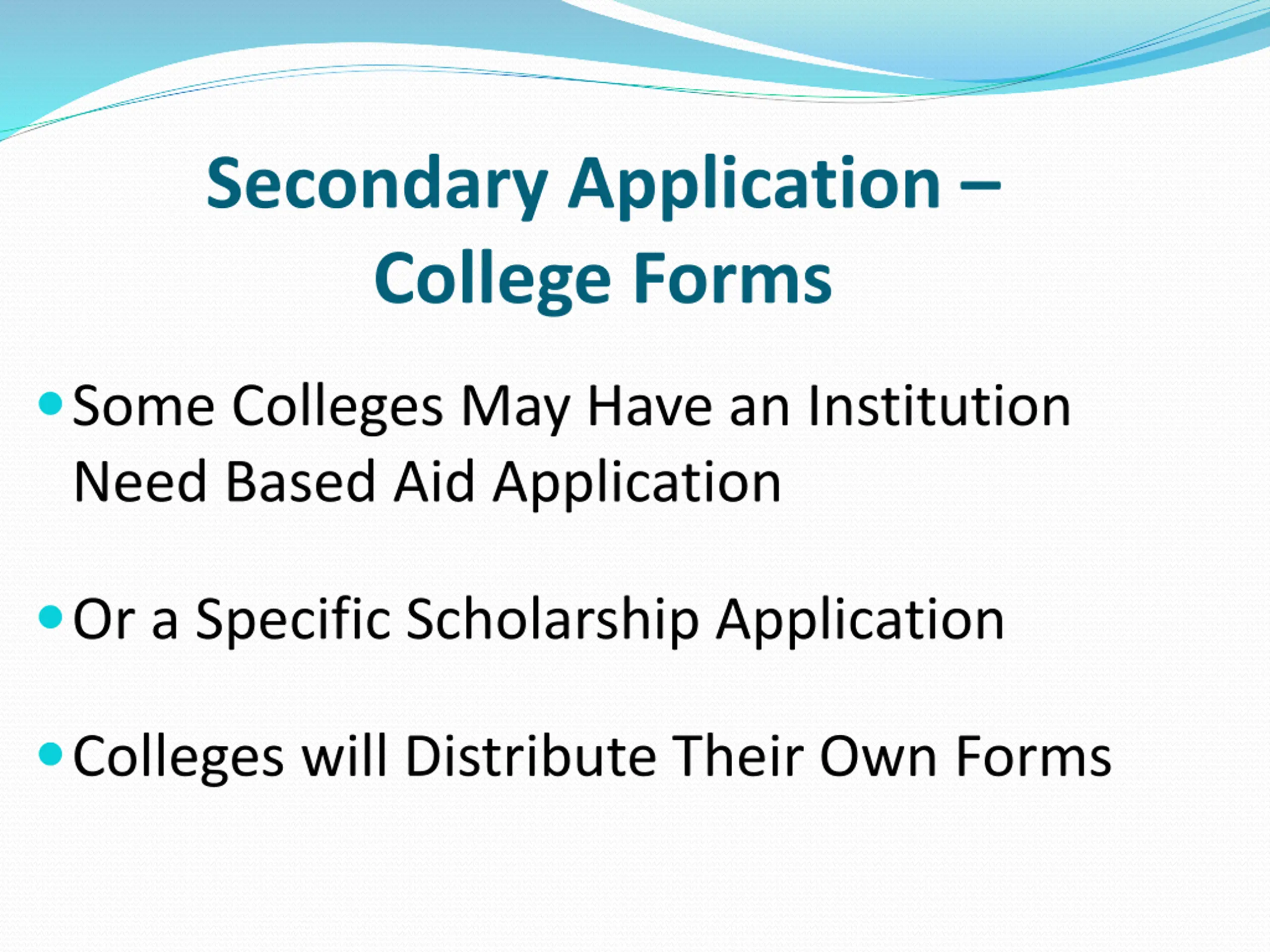 Secondary Application College Forms Some Colleges May Have an Institution Need Based Aid Application Or a Specific Scholarship Application Colleges will Distribute Their Own Forms