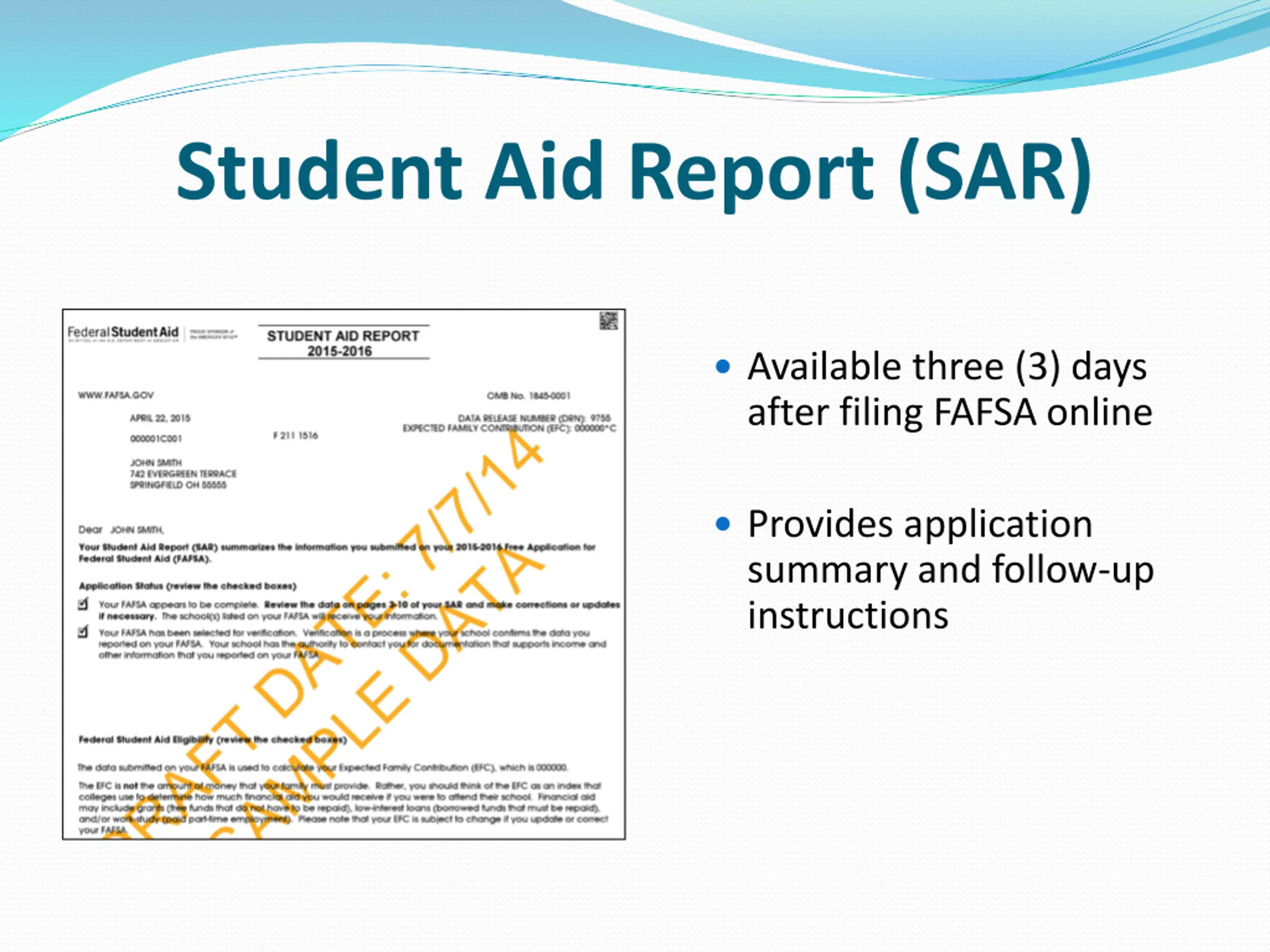 Student Aid Report (SAR) Available three (3) days after filing FAFSA online Provides application summary and follow-up instructions