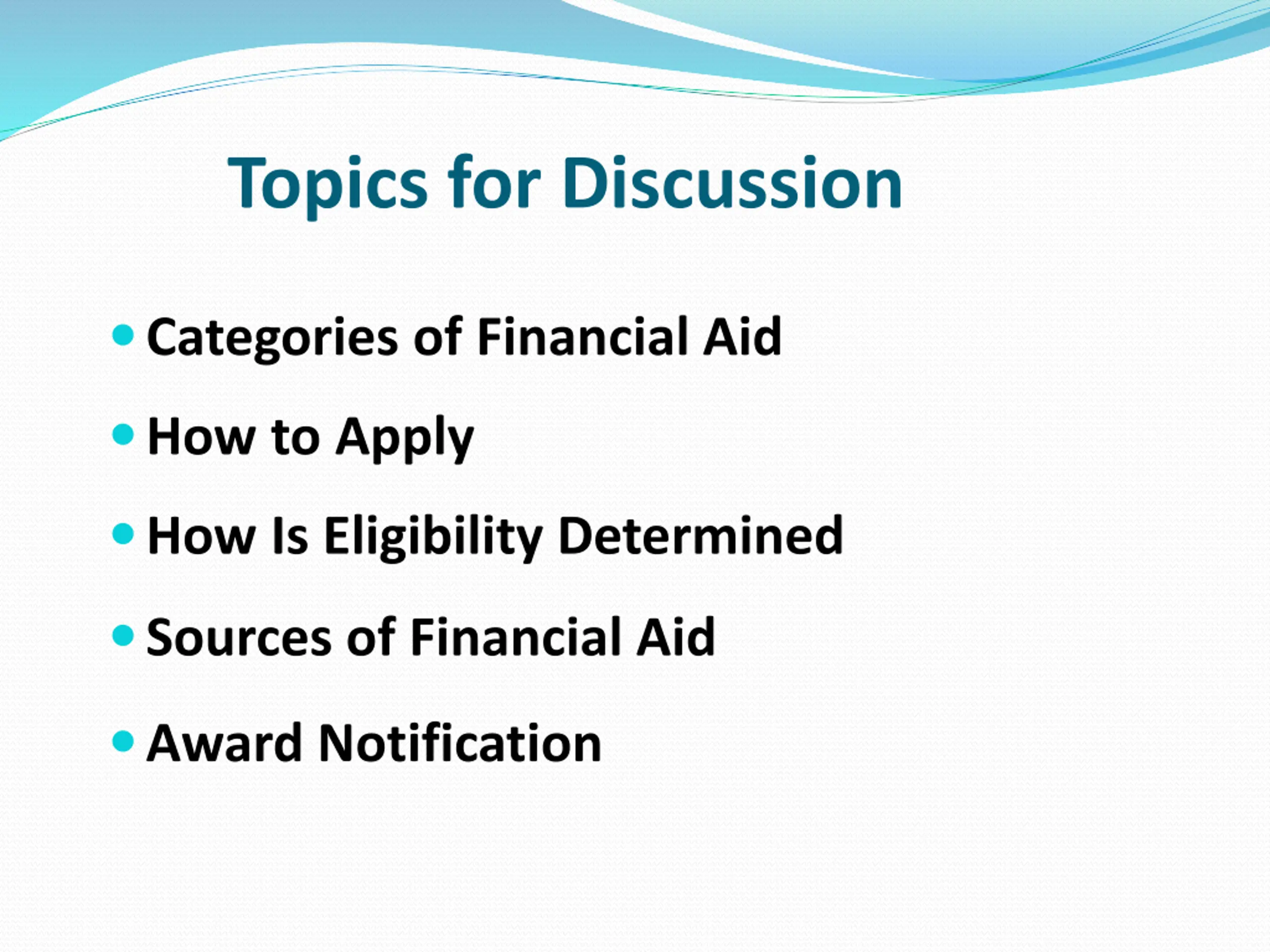 Topics for Discussion Categories of Financial Aid How to Apply How Is Eligibility Determined Sources of Financial Aid Award Notification