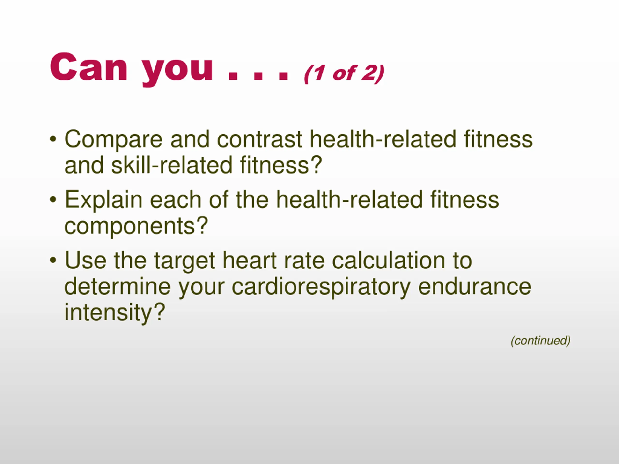 Can you . . . (1 of 2) Compare and contrast health-related fitness and skill-related fitness? Explain each of the health-related fitness components? Use the target heart rate calculation to determine your cardiorespiratory endurance intensity? (continued)