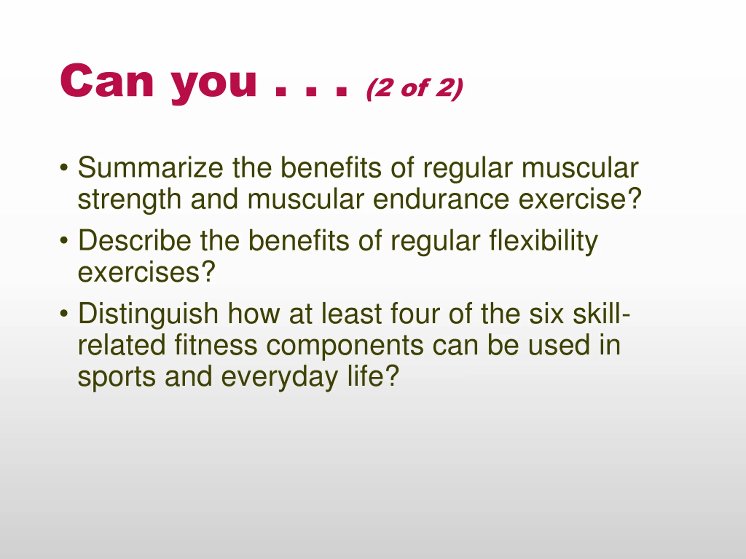 Can you . . . (2 of 2) Summarize the benefits of regular muscular strength and muscular endurance exercise? Describe the benefits of regular flexibility exercises? Distinguish how at least four of the six skill- related fitness components can be used in sports and everyday life?