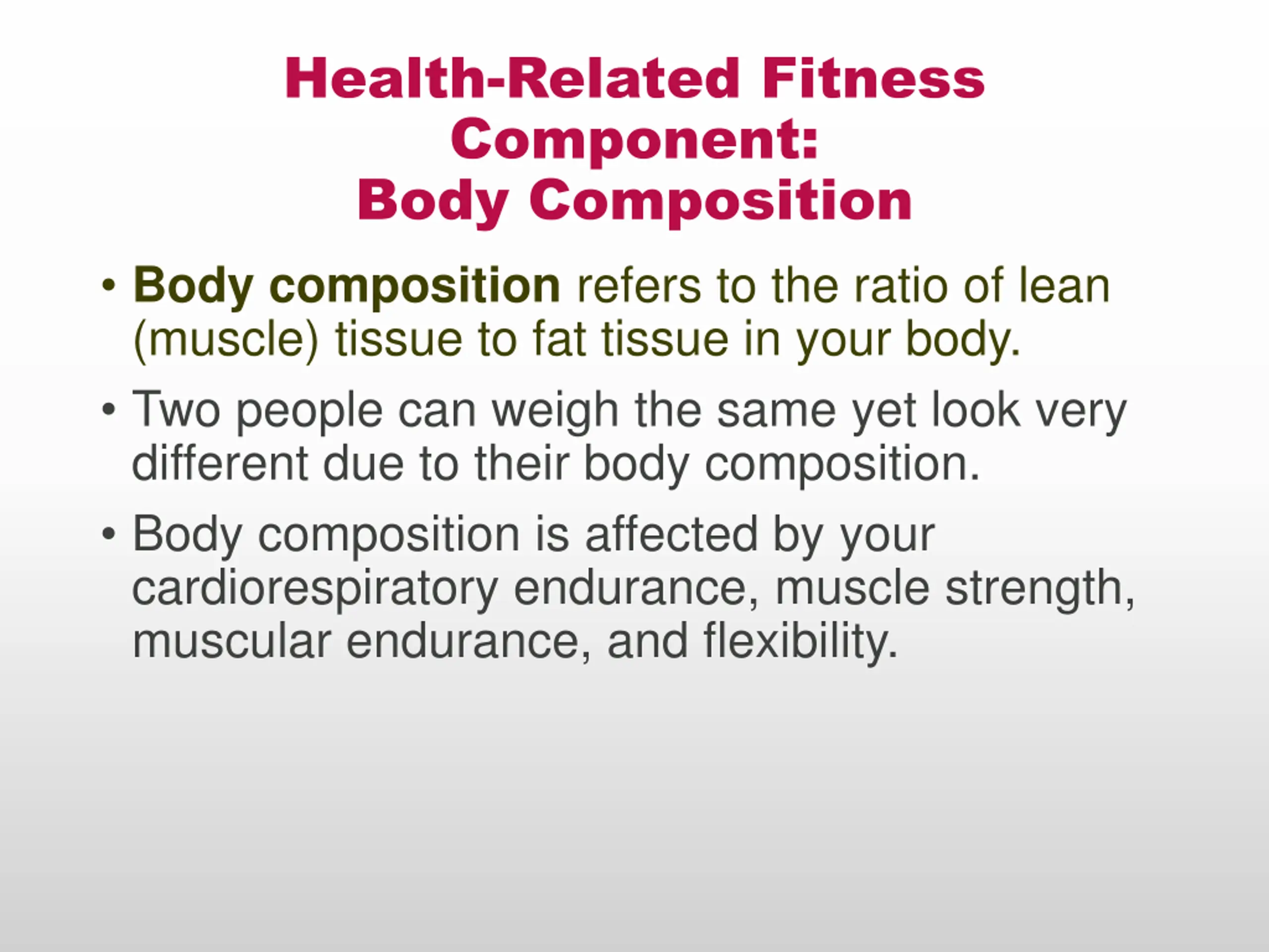 Health-Related Fitness Component: Body Composition Body composition refers to the ratio of lean (muscle) tissue to fat tissue in your body. Two people can weigh the same yet look very different due to their body composition. Body composition is affected by your cardiorespiratory endurance, muscle strength, muscular endurance, and flexibility.