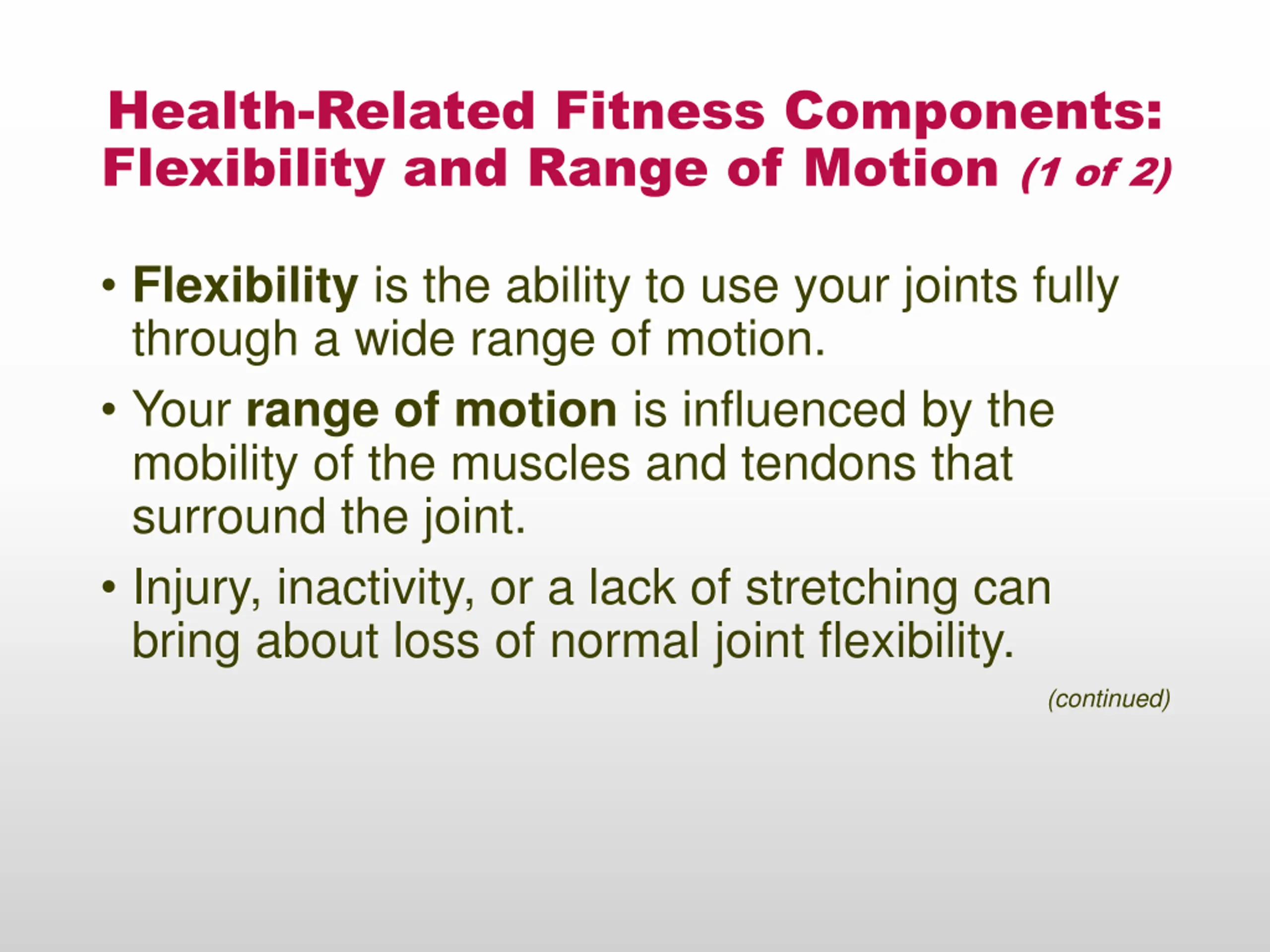 Health-Related Fitness Components: Flexibility and Range of Motion (1 of 2) Flexibility is the ability to use your joints fully through a wide range of motion. Your range of motion is influenced by the mobility of the muscles and tendons that surround the joint. Injury, inactivity, or a lack of stretching can bring about loss of normal joint flexibility. (continued)