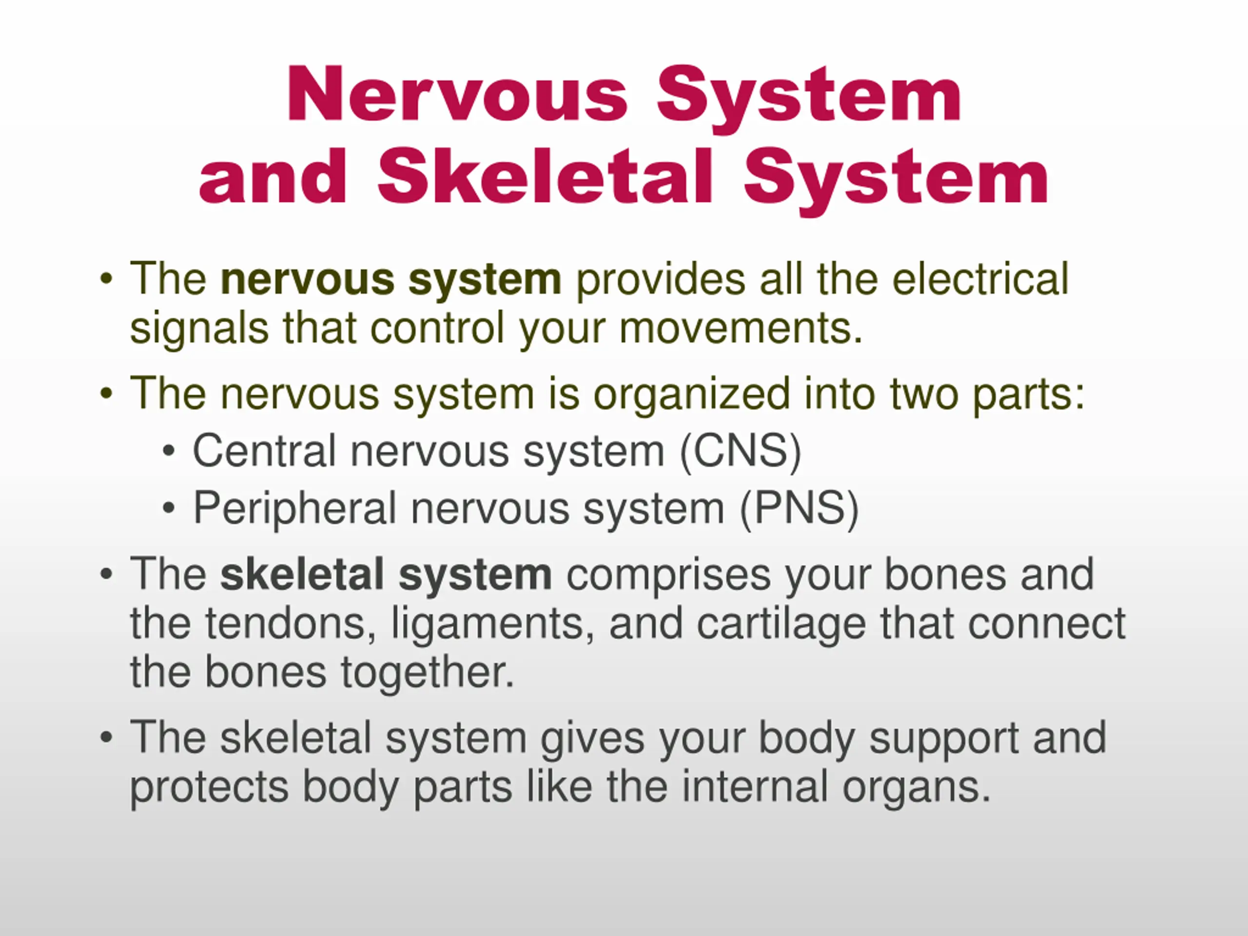 Nervous System and Skeletal System The nervous system provides all the electrical signals that control your movements. The nervous system is organized into two parts: Central nervous system (CNS) Peripheral nervous system (PNS) The skeletal system comprises your bones and the tendons, ligaments, and cartilage that connect the bones together. The skeletal system gives your body support and protects body parts like the internal organs.