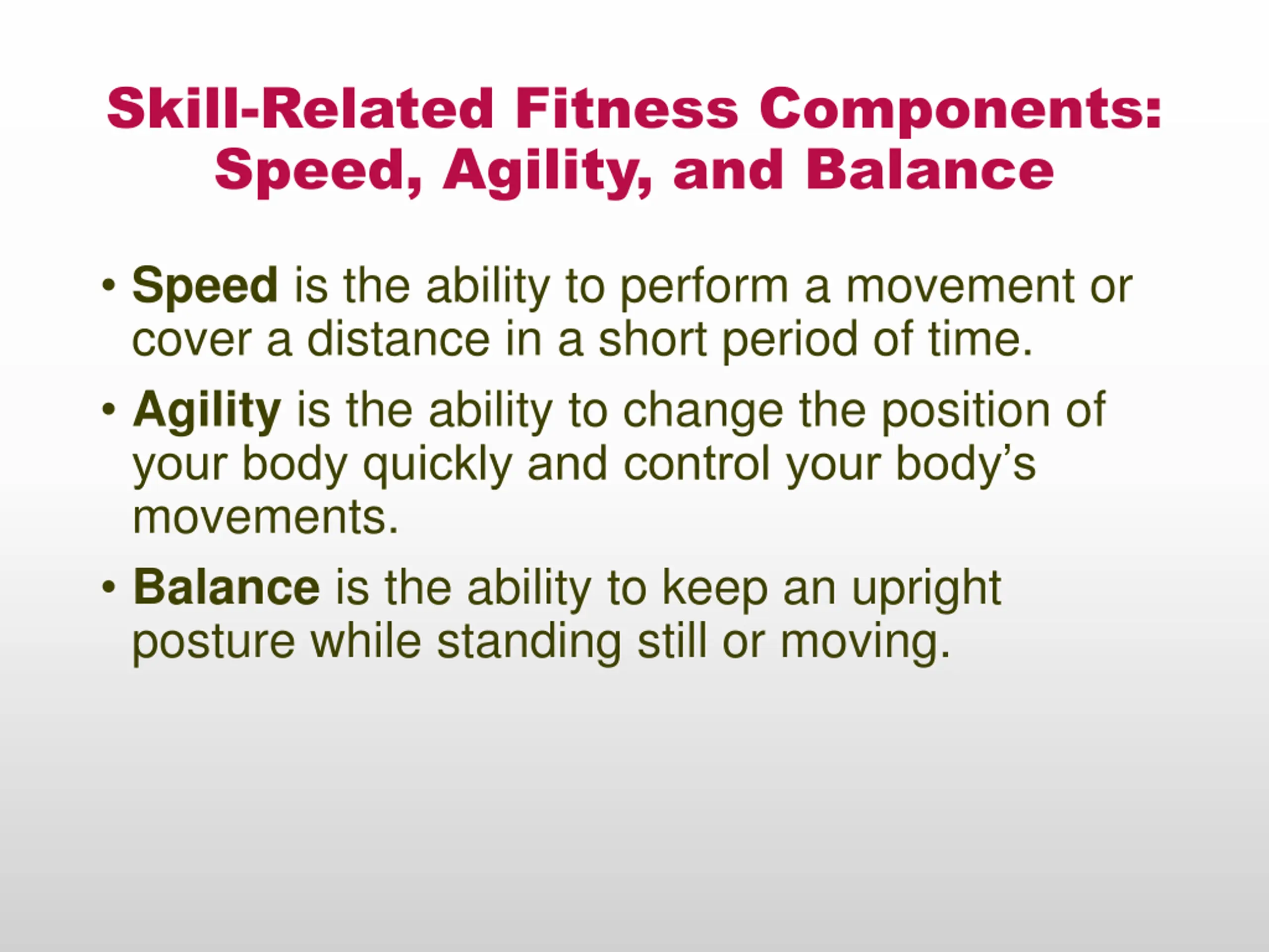 Skill-Related Fitness Components: Speed, Agility, and Balance Speed is the ability to perform a movement or cover a distance in a short period of time. Agility is the ability to change the position of your body quickly and control your body s movements. Balance is the ability to keep an upright posture while standing still or moving.