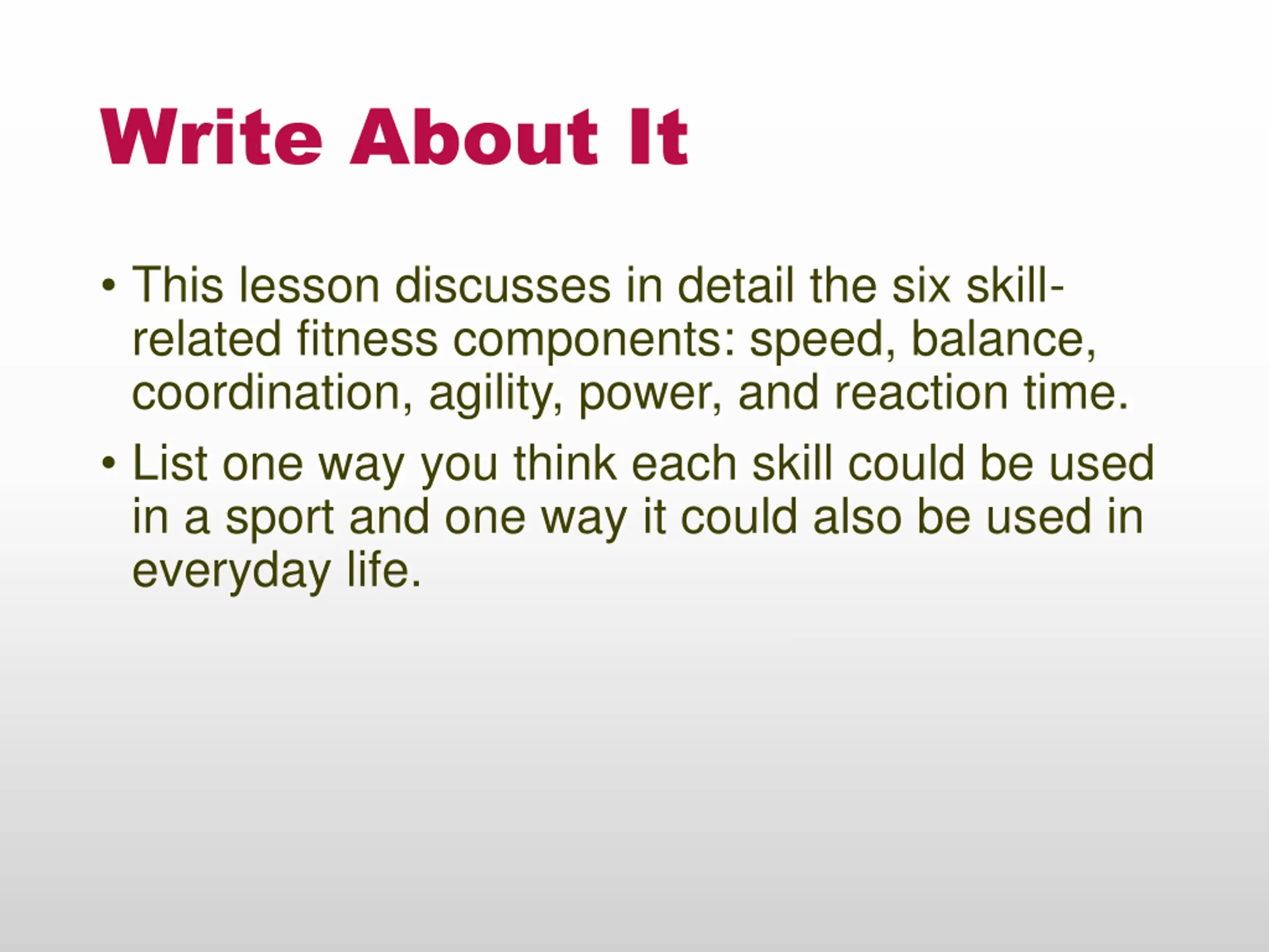 Write About It This lesson discusses in detail the six skill- related fitness components: speed, balance, coordination, agility, power, and reaction time. List one way you think each skill could be used in a sport and one way it could also be used in everyday life.