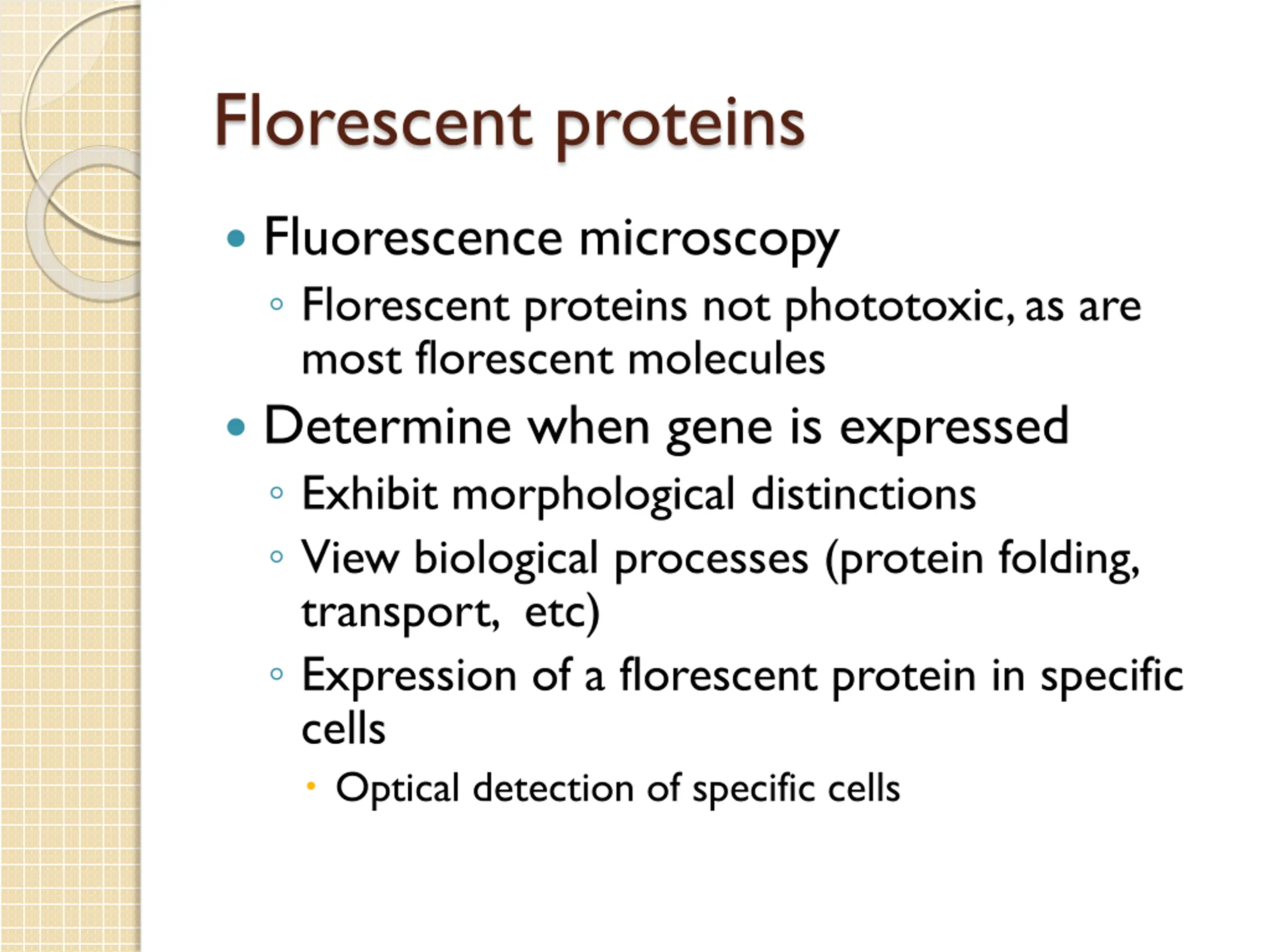 Florescent proteins Fluorescence microscopy Florescent proteins not phototoxic, as are most florescent molecules Determine when gene is expressed Exhibit morphological distinctions View biological processes (protein folding, transport, etc) Expression of a florescent protein in specific cells Optical detection of specific cells