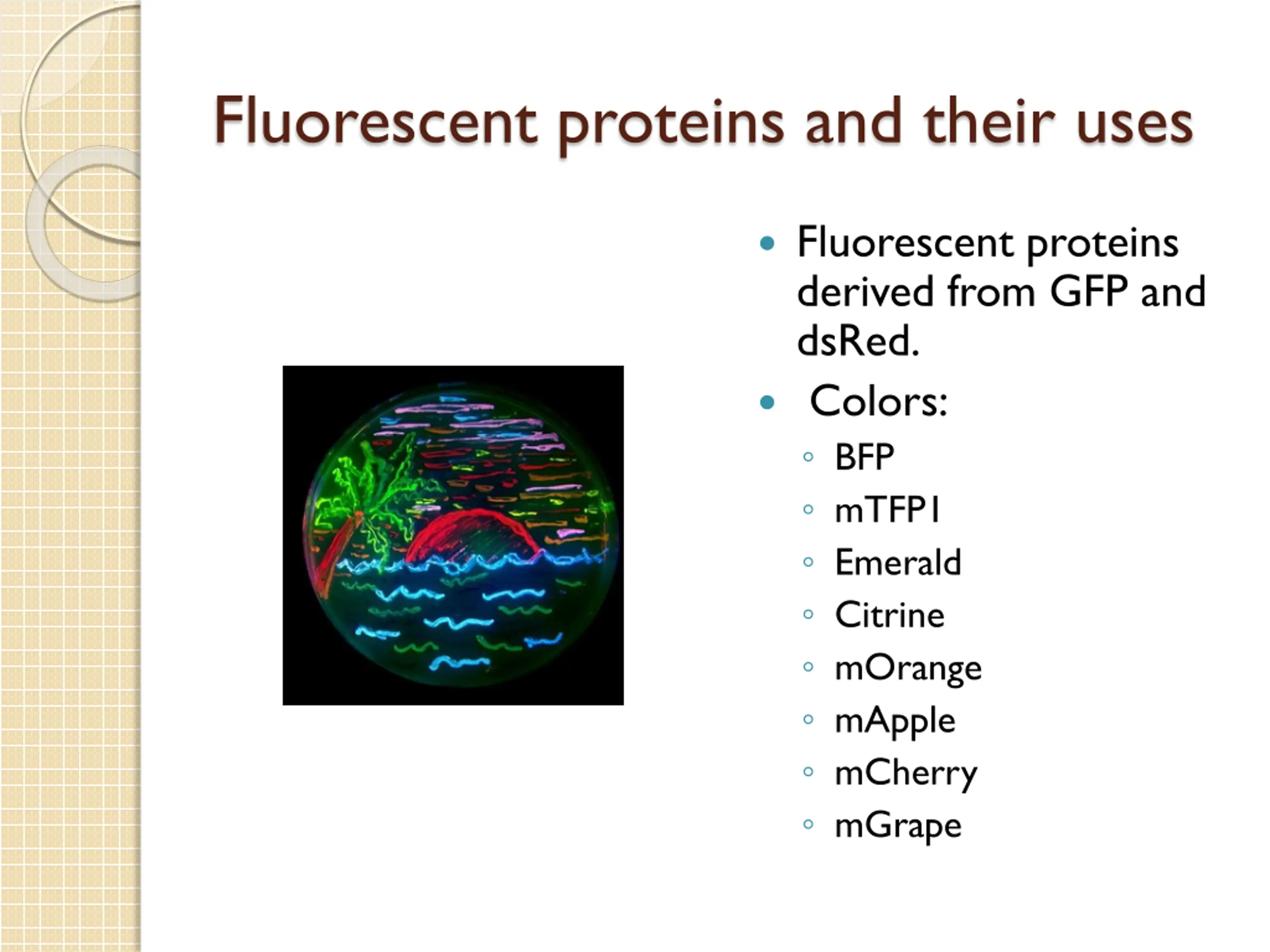 Fluorescent proteins and their uses Fluorescent proteins derived from GFP and dsRed. Colors: BFP mTFP1 Emerald Citrine mOrange mApple mCherry mGrape