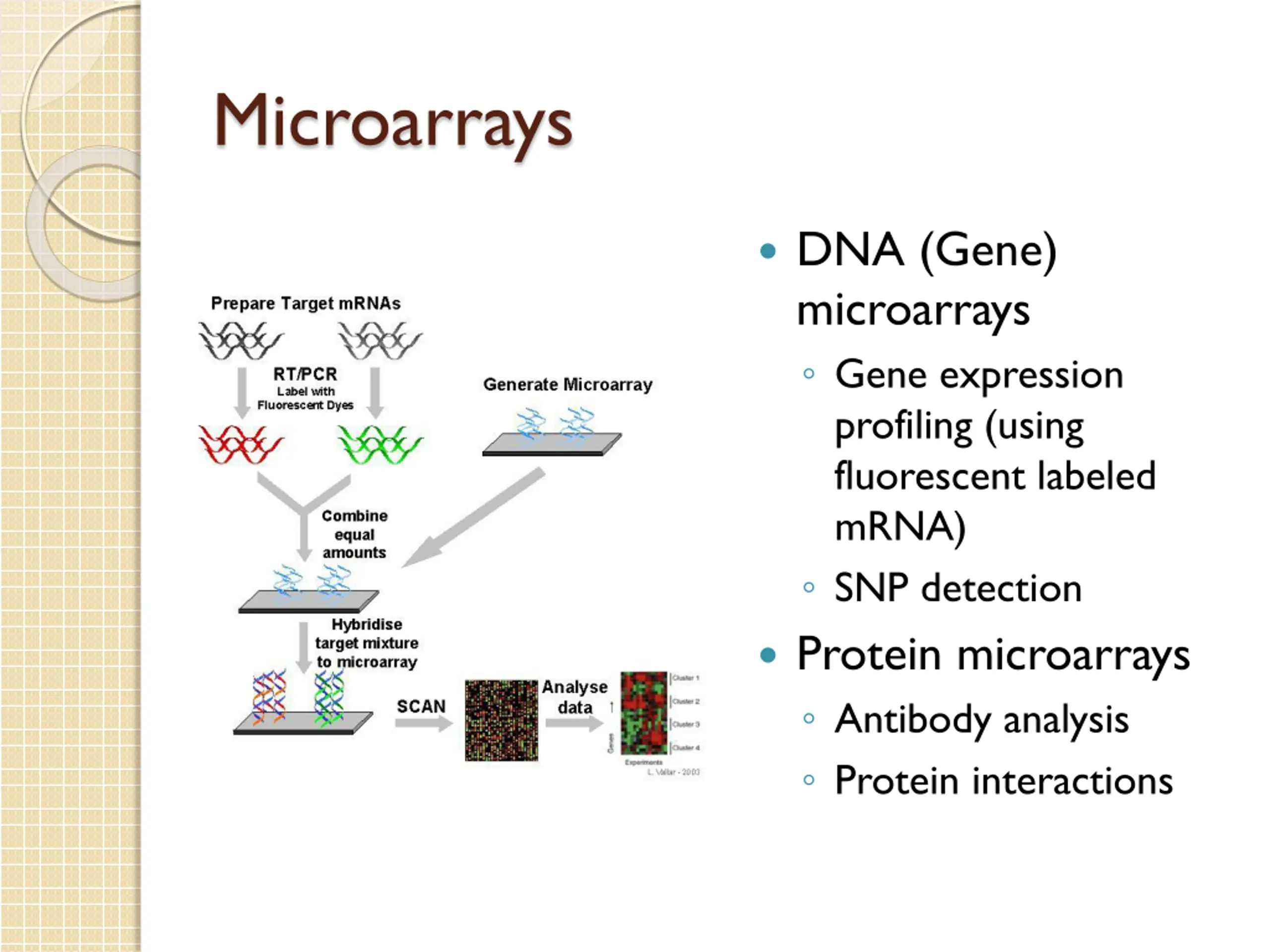 Microarrays DNA (Gene) microarrays Gene expression profiling (using fluorescent labeled mRNA) SNP detection Protein microarrays Antibody analysis Protein interactions