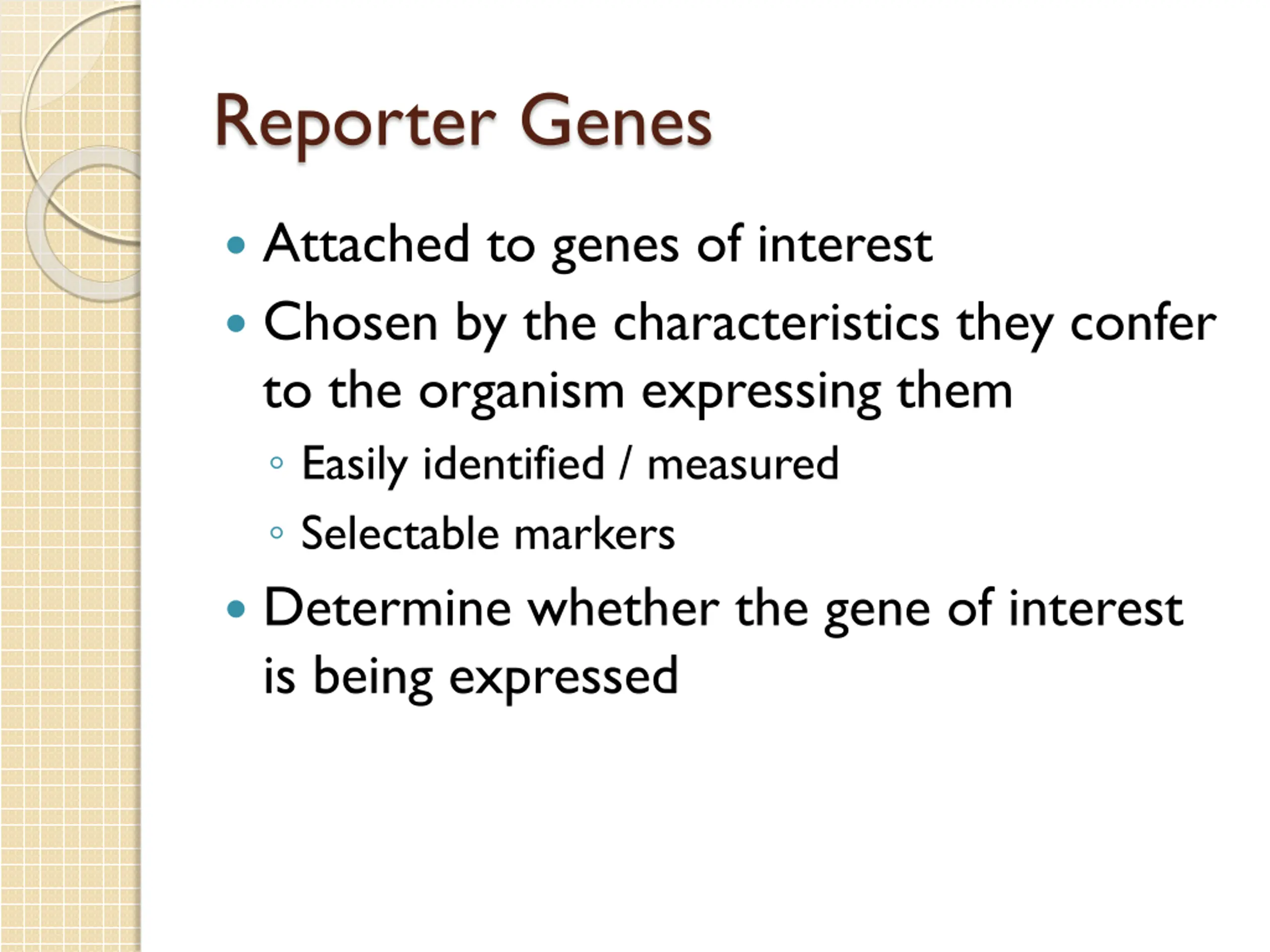 Reporter Genes Attached to genes of interest Chosen by the characteristics they confer to the organism expressing them Easily identified / measured Selectable markers Determine whether the gene of interest is being expressed