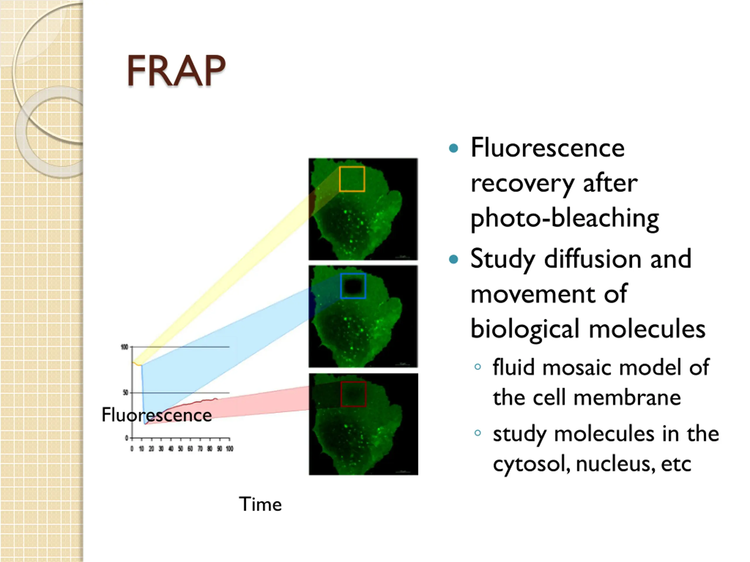 FRAP Fluorescence recovery after photo-bleaching Study diffusion and movement of biological molecules fluid mosaic model of the cell membrane study molecules in the cytosol, nucleus, etc Fluorescence Time