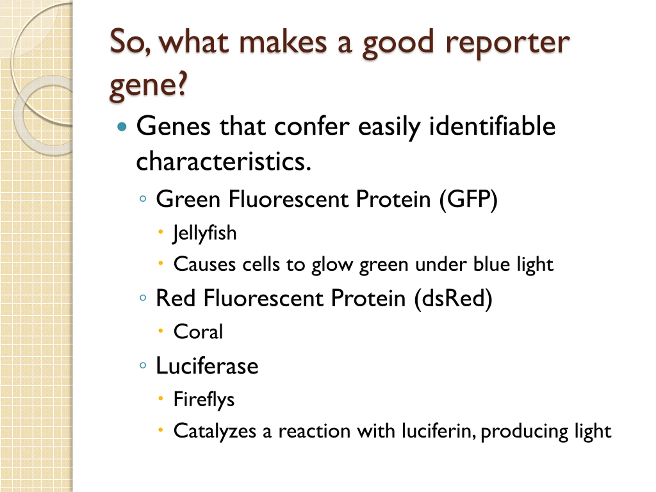 So, what makes a good reporter gene? Genes that confer easily identifiable characteristics. Green Fluorescent Protein (GFP) Jellyfish Causes cells to glow green under blue light Red Fluorescent Protein (dsRed) Coral Luciferase Fireflys Catalyzes a reaction with luciferin, producing light