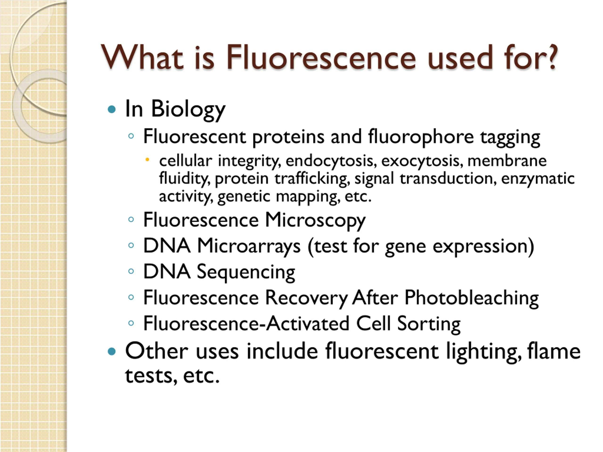 What is Fluorescence used for? In Biology Fluorescent proteins and fluorophore tagging cellular integrity, endocytosis, exocytosis, membrane fluidity, protein trafficking, signal transduction, enzymatic activity, genetic mapping, etc. Fluorescence Microscopy DNA Microarrays (test for gene expression) DNA Sequencing Fluorescence Recovery After Photobleaching Fluorescence-Activated Cell Sorting Other uses include fluorescent lighting, flame tests, etc.