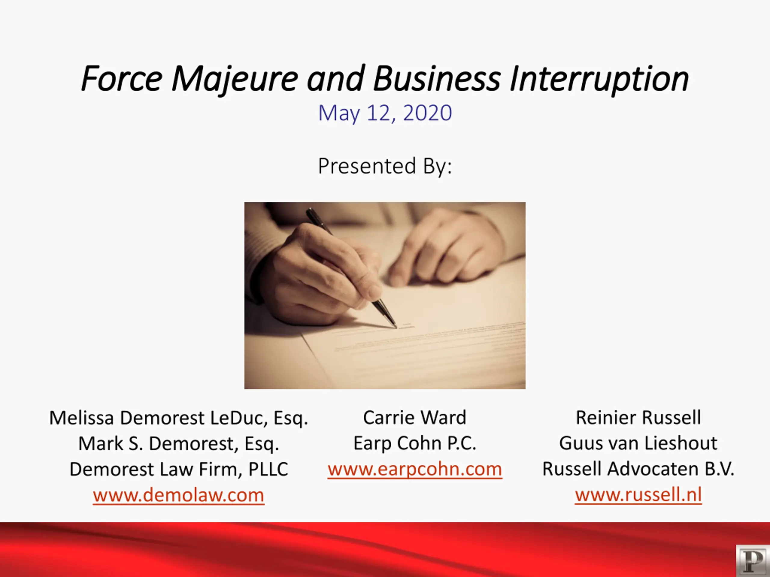 Force Majeure and Business Interruption Force Majeure and Business Interruption May 12, 2020 Presented By: Carrie Ward Earp Cohn P.C. www.earpcohn.com Reinier Russell Guus van Lieshout Russell Advocaten B.V. www.russell.nl Melissa Demorest LeDuc, Esq. Mark S. Demorest, Esq. Demorest Law Firm, PLLC www.demolaw.com
