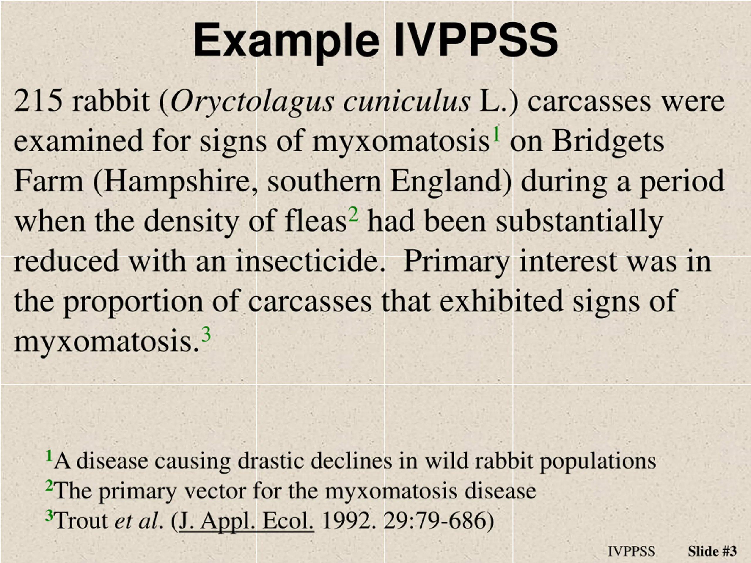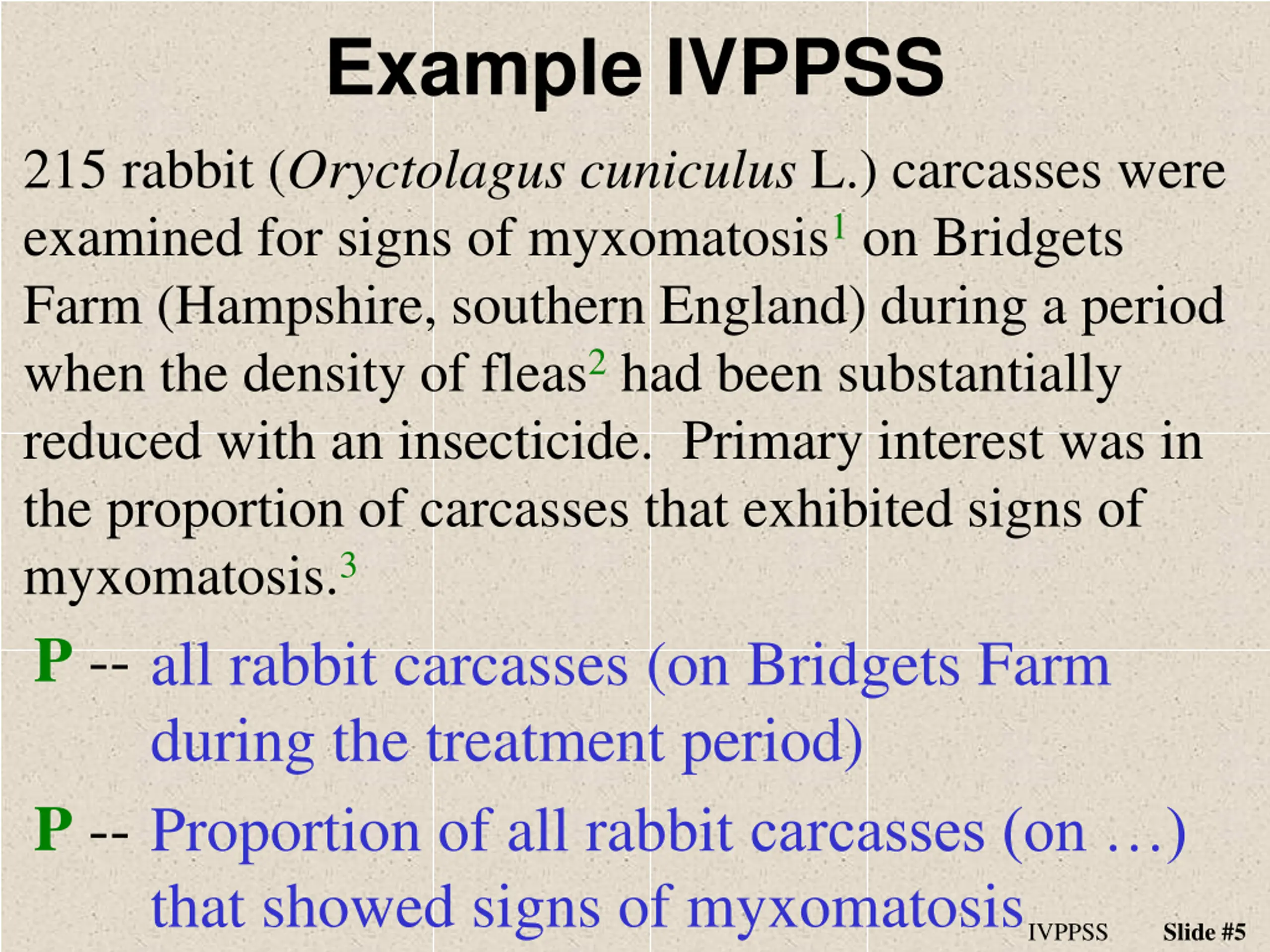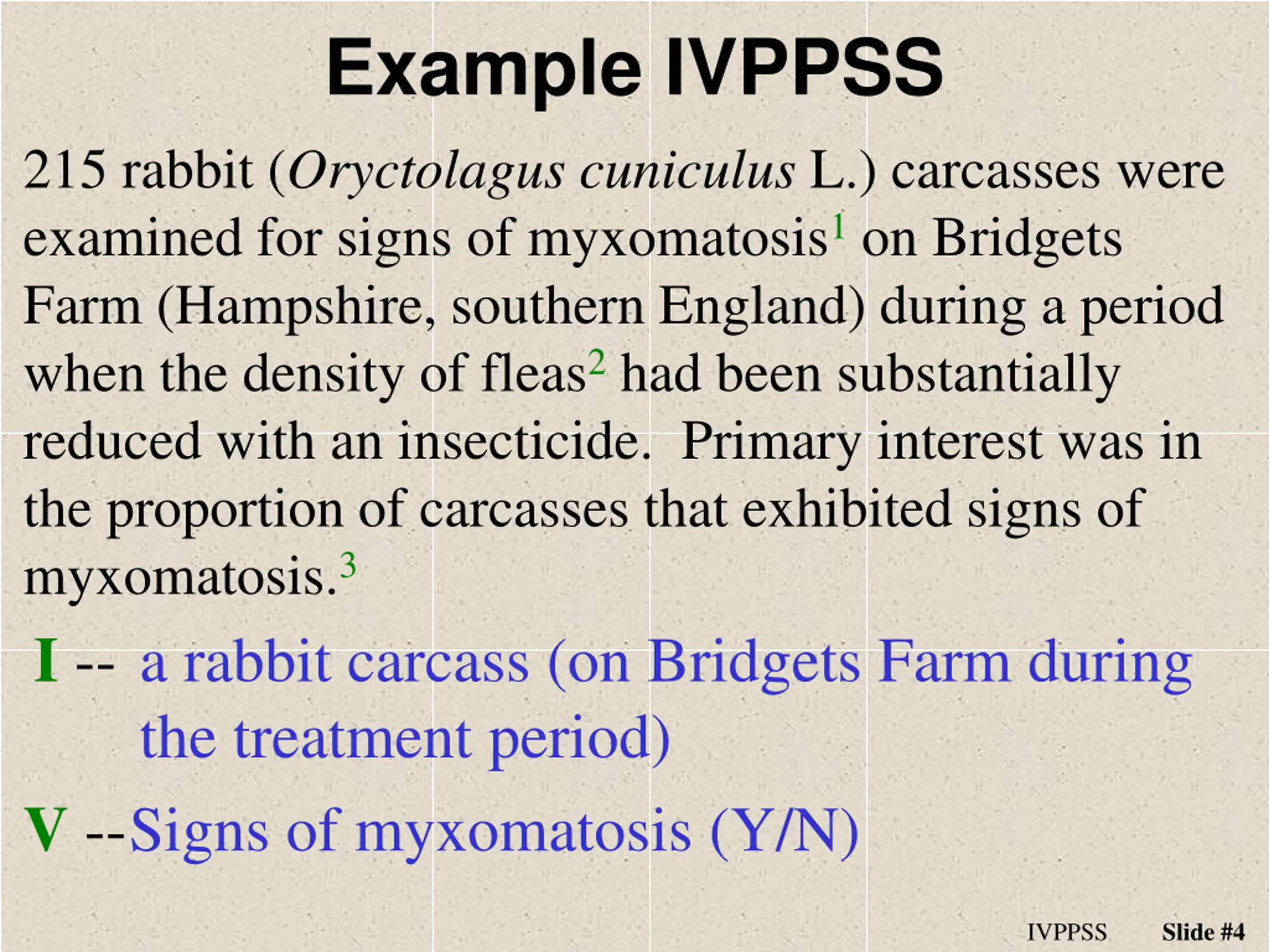 Example IVPPSS 215 rabbit (Oryctolagus cuniculus L.) carcasses were examined for signs of myxomatosis1 on Bridgets Farm (Hampshire, southern England) during a period when the density of fleas2 had been substantially reduced with an insecticide. Primary interest was in the proportion of carcasses that exhibited signs of myxomatosis.3 I -- a rabbit carcass (on Bridgets Farm during the treatment period) V --Signs of myxomatosis (Y/N) Slide #4 IVPPSS
