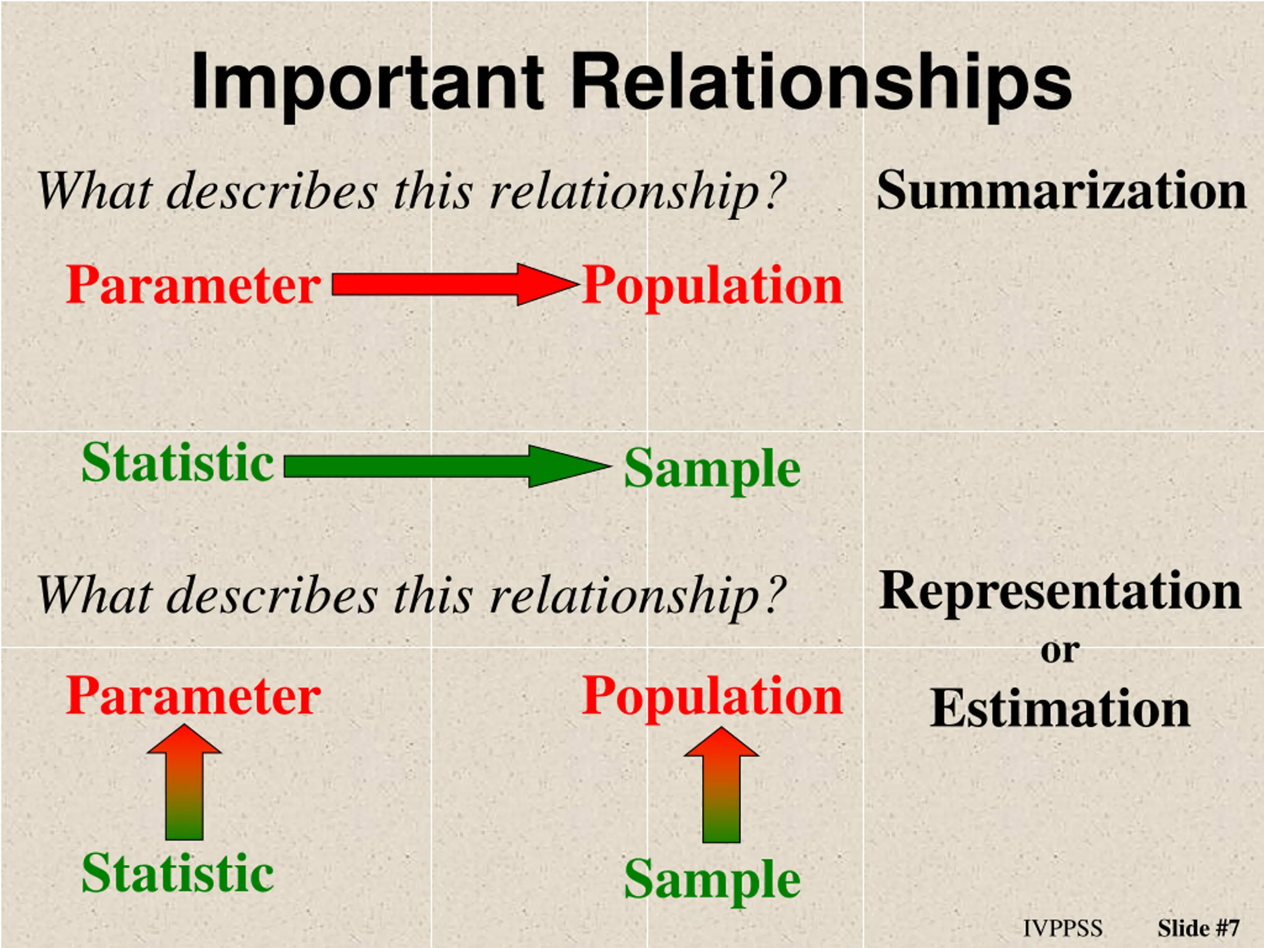 Important Relationships Summarization What describes this relationship? Parameter Population Statistic Sample Representation or Estimation What describes this relationship? Parameter Population Statistic Sample Slide #7 IVPPSS