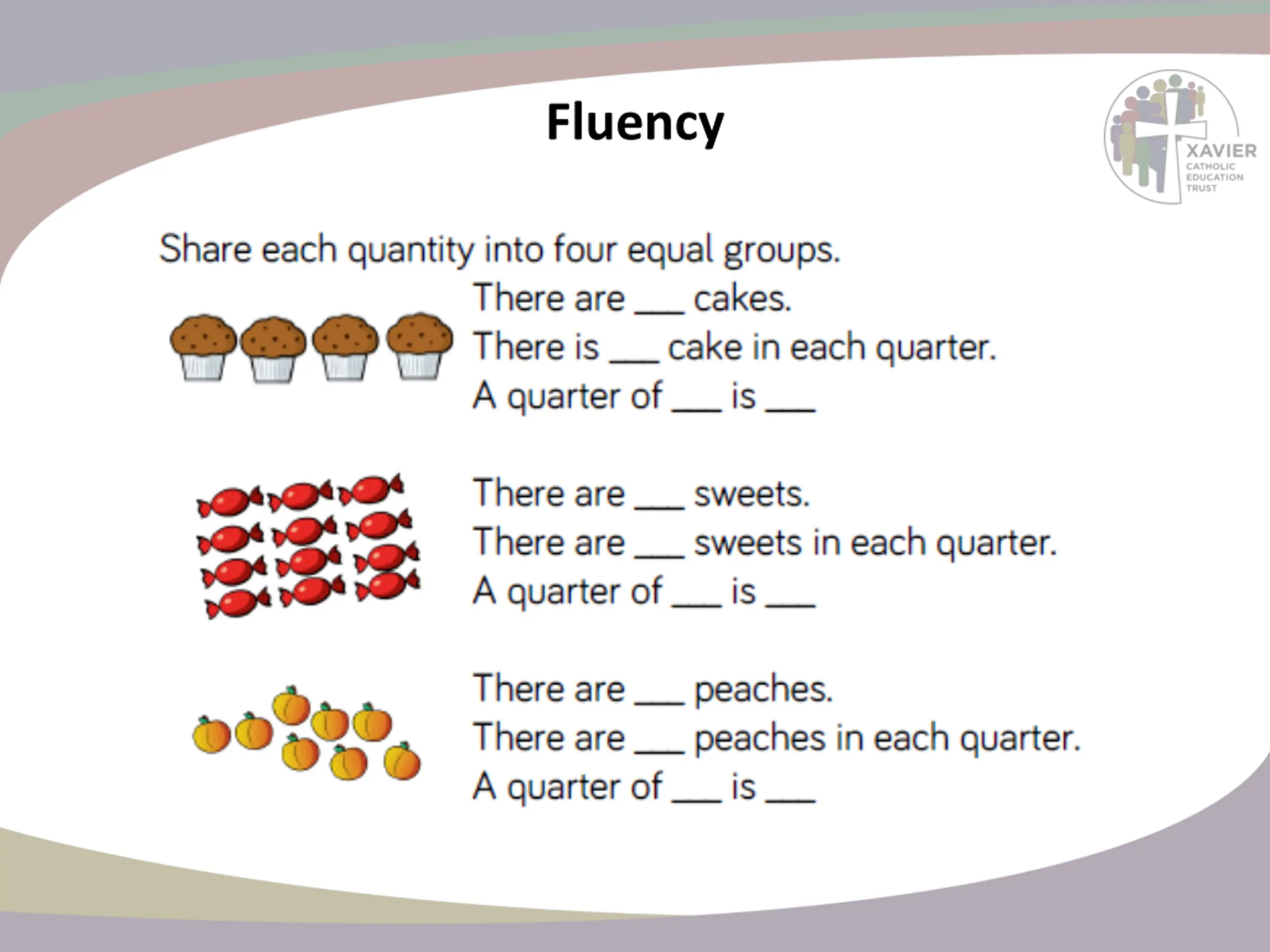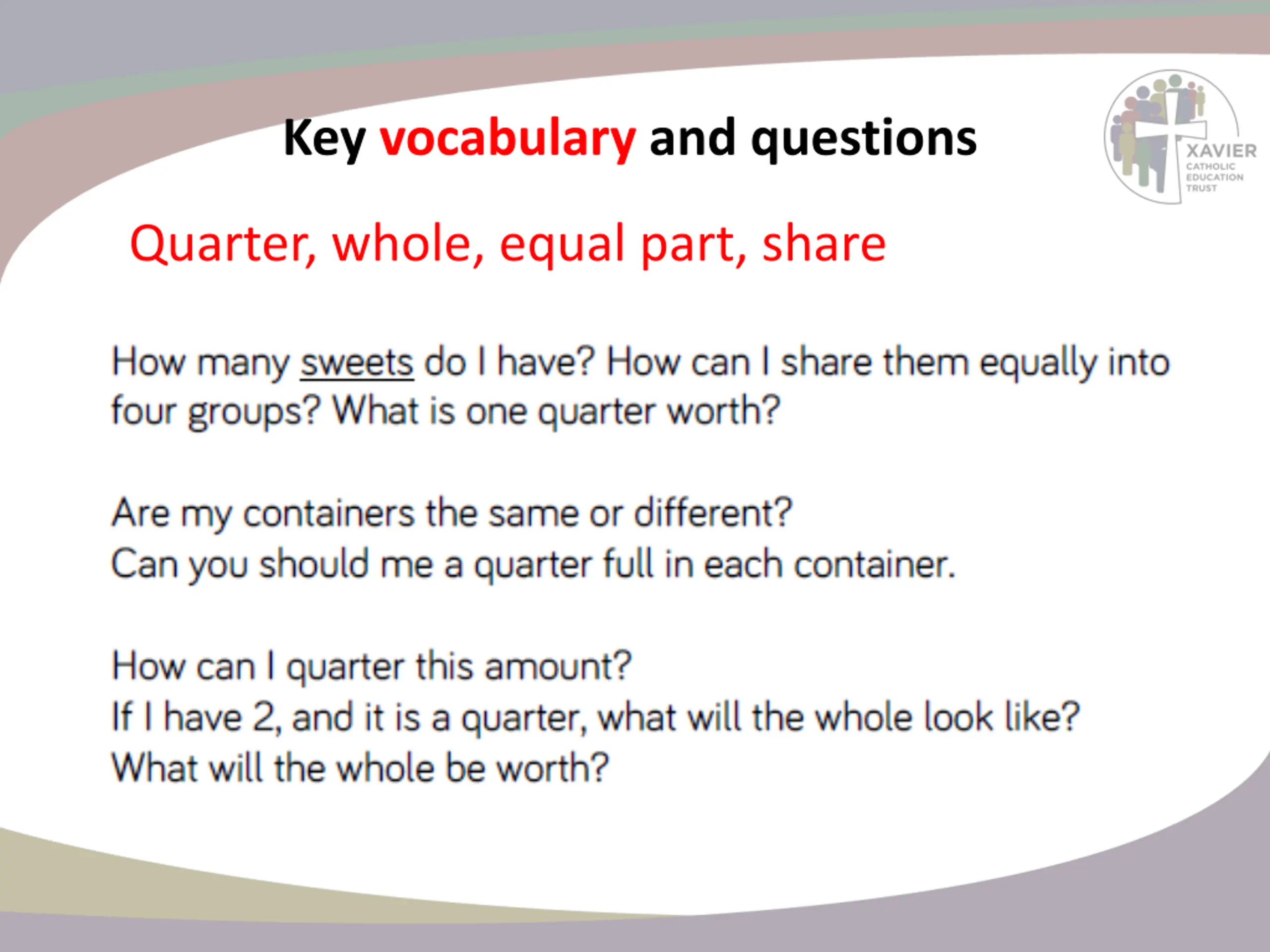 Year 1 Summer Block 2 Number: Fractions Find a quarter of a quantity NCLO: Recognise, find and name a quarter as one of two equal parts of an object, shape or quantity.