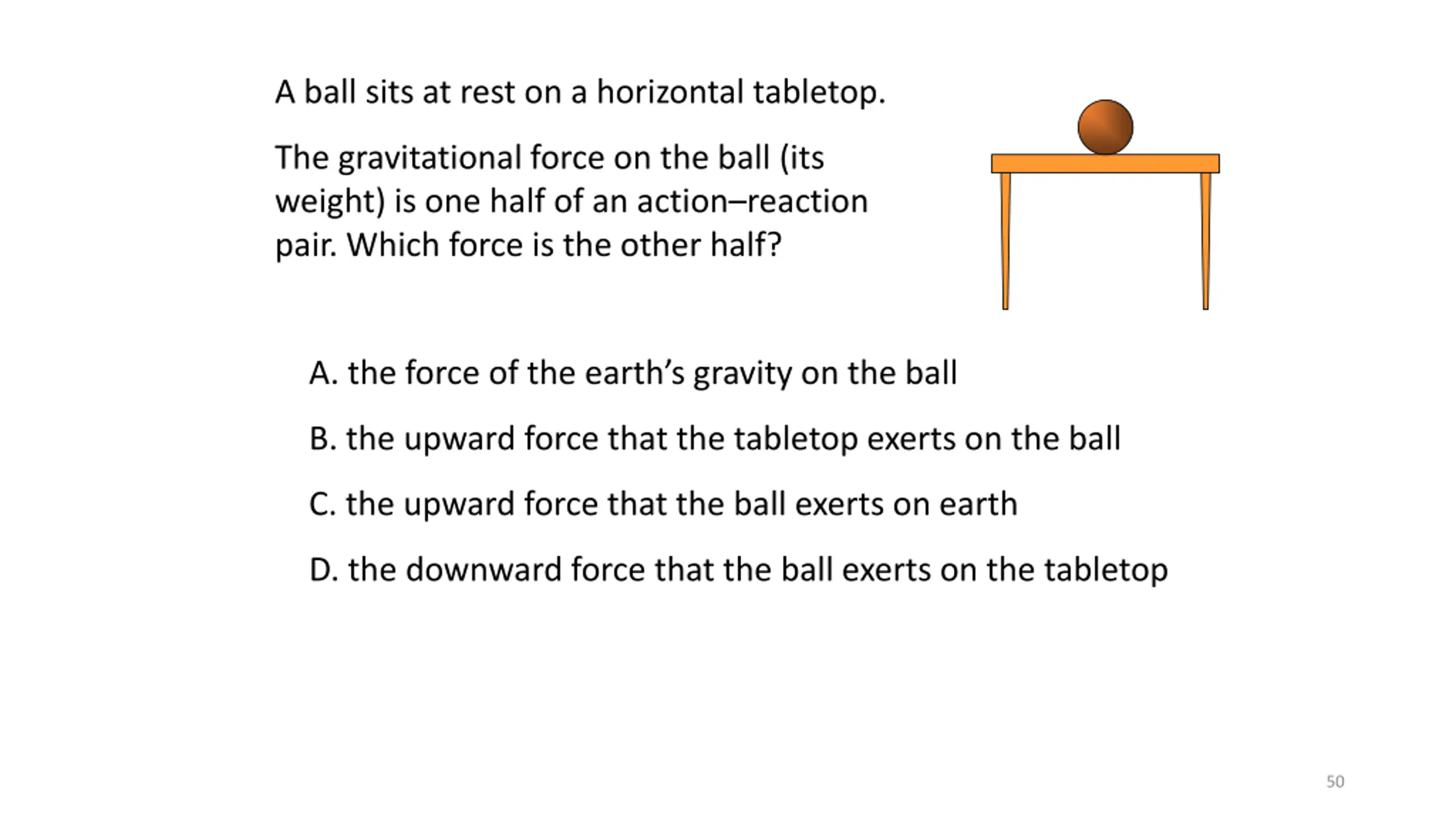 A ball sits at rest on a horizontal tabletop. The gravitational force on the ball (its weight) is one half of an action reaction pair. Which force is the other half? A. the force of the earth s gravity on the ball B. the upward force that the tabletop exerts on the ball C. the upward force that the ball exerts on earth D. the downward force that the ball exerts on the tabletop 50