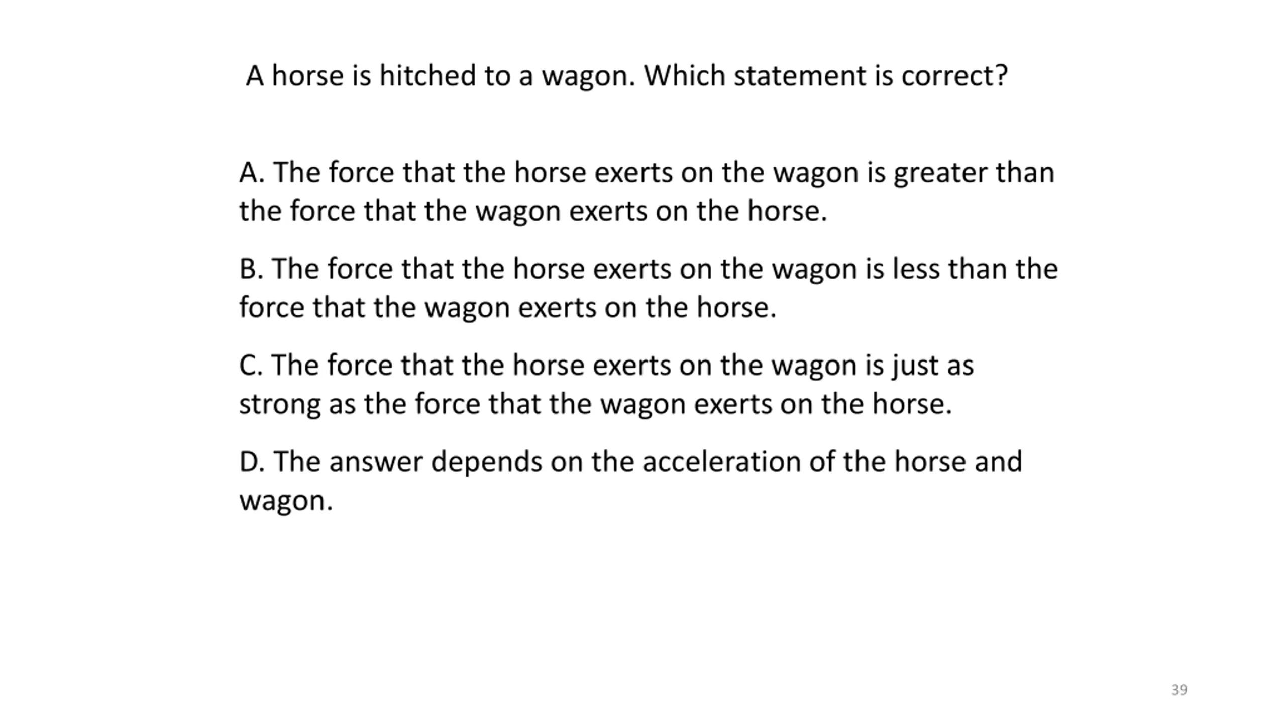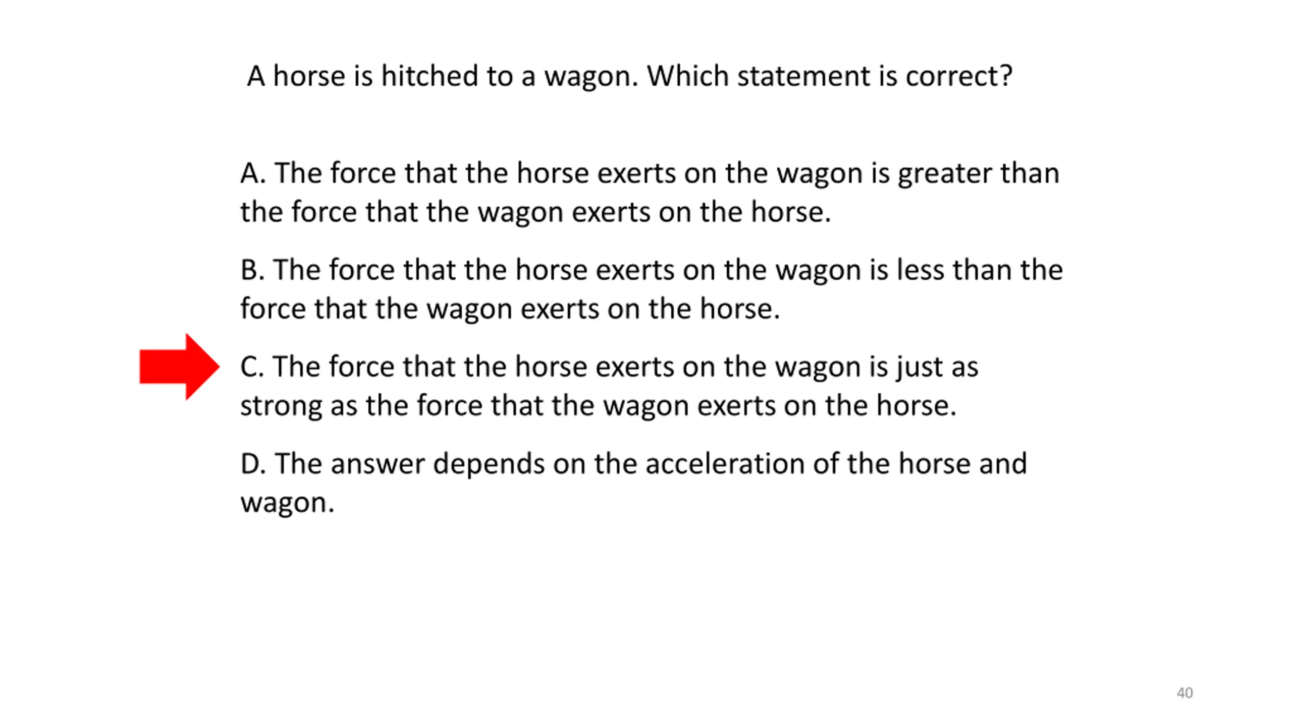 A horse is hitched to a wagon. Which statement is correct? A. The force that the horse exerts on the wagon is greater than the force that the wagon exerts on the horse. B. The force that the horse exerts on the wagon is less than the force that the wagon exerts on the horse. C. The force that the horse exerts on the wagon is just as strong as the force that the wagon exerts on the horse. D. The answer depends on the acceleration of the horse and wagon. 39
