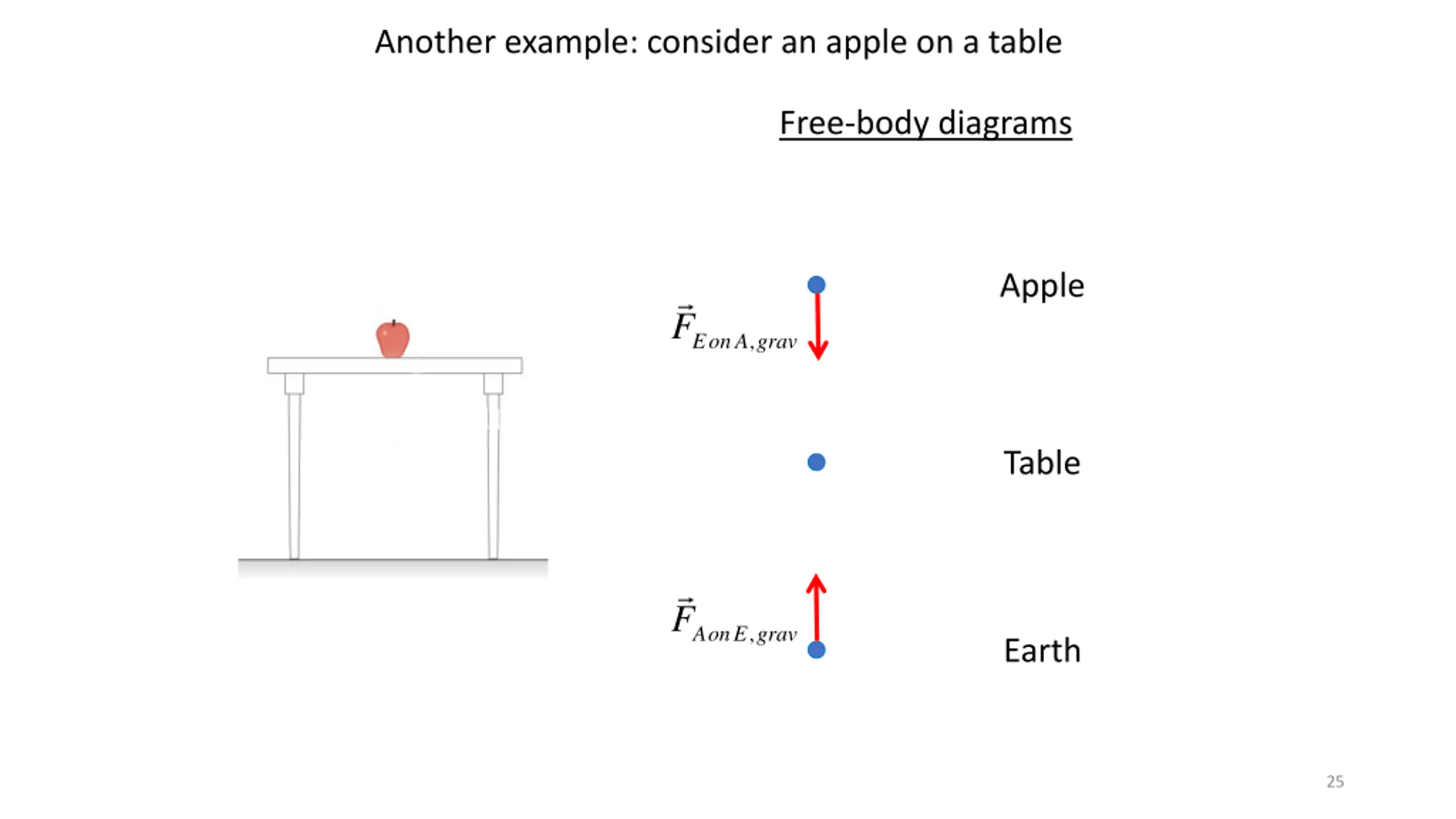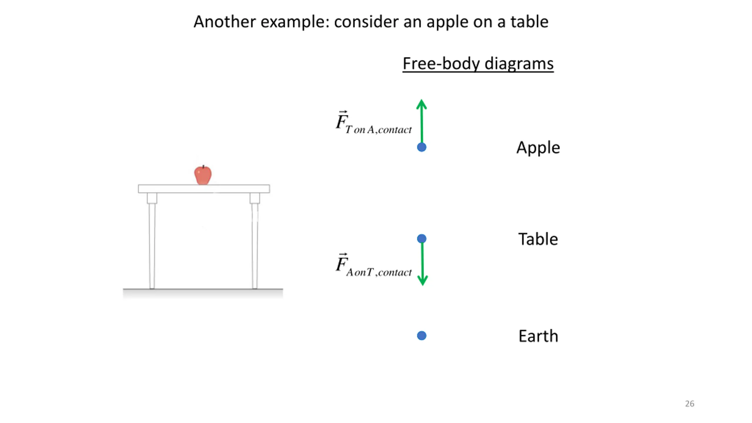 Another example: consider an apple on a table Free-body diagrams Apple EonA grav F , Table AonE grav F , Earth 25