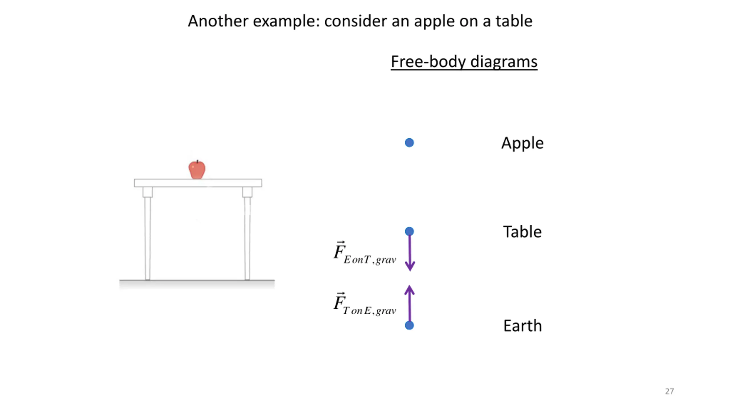 Another example: consider an apple on a table Free-body diagrams T onA contact F , Apple Table AonT contact F , Earth 26