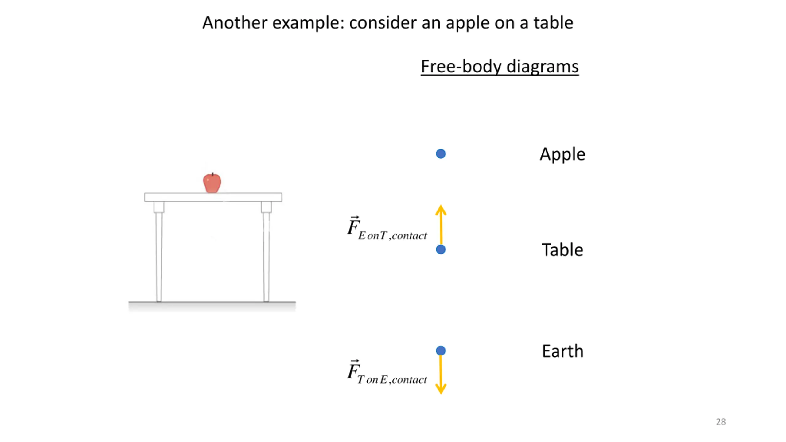 Another example: consider an apple on a table Free-body diagrams Apple EonT contact F , Table Earth T onE contact F , 28