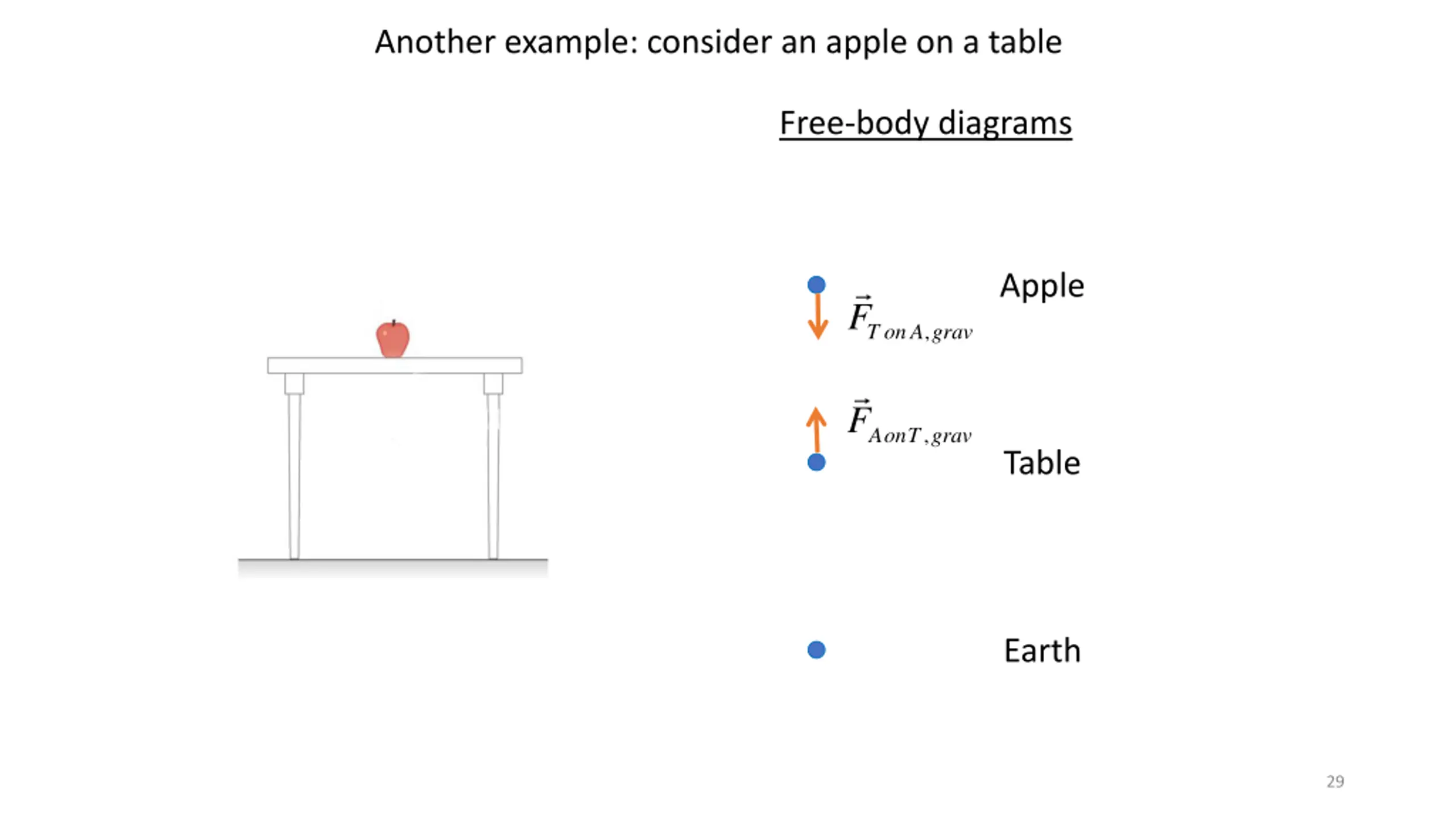 Another example: consider an apple on a table Free-body diagrams Apple T onA grav F , AonT grav F , Table Earth 29