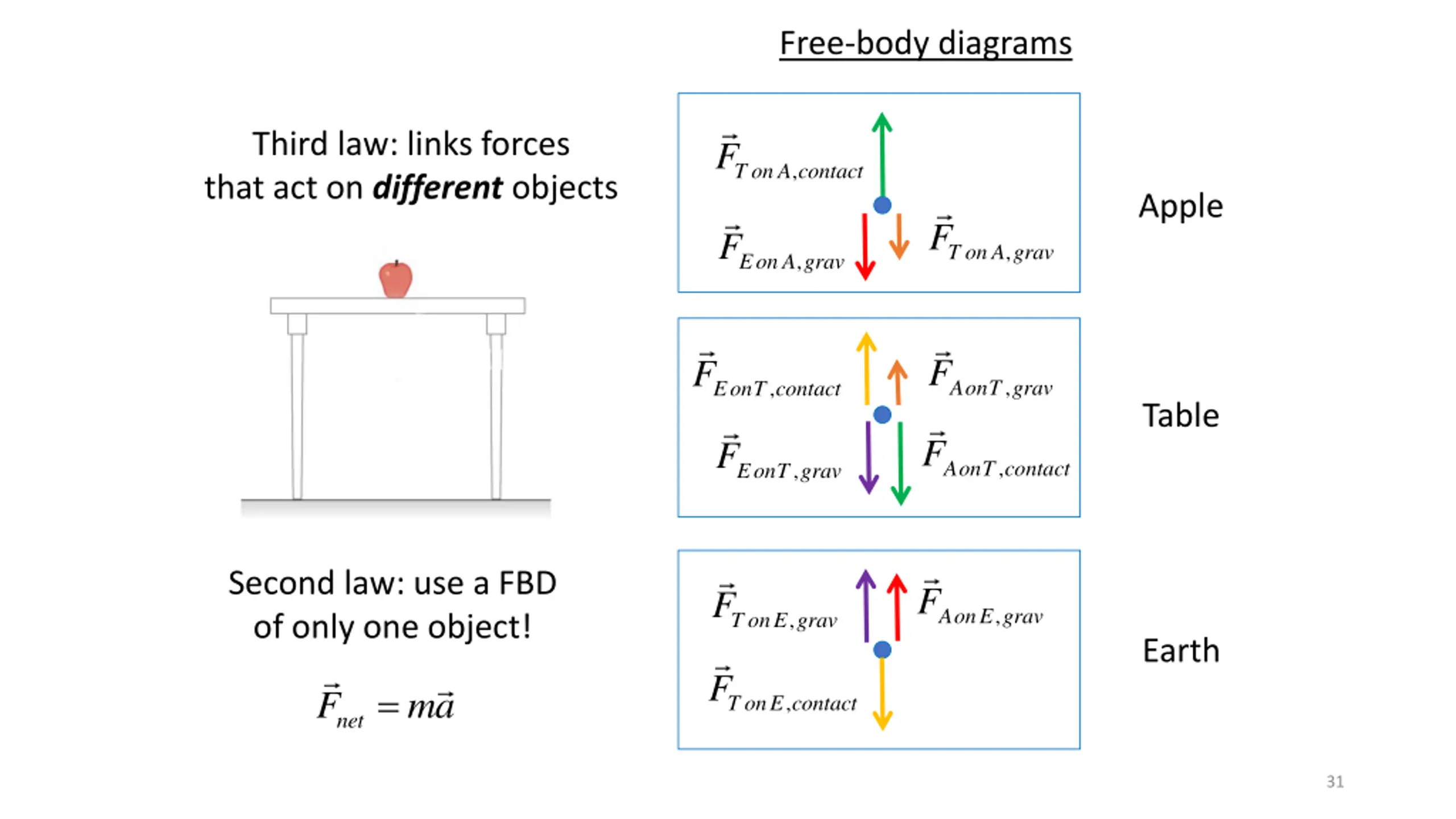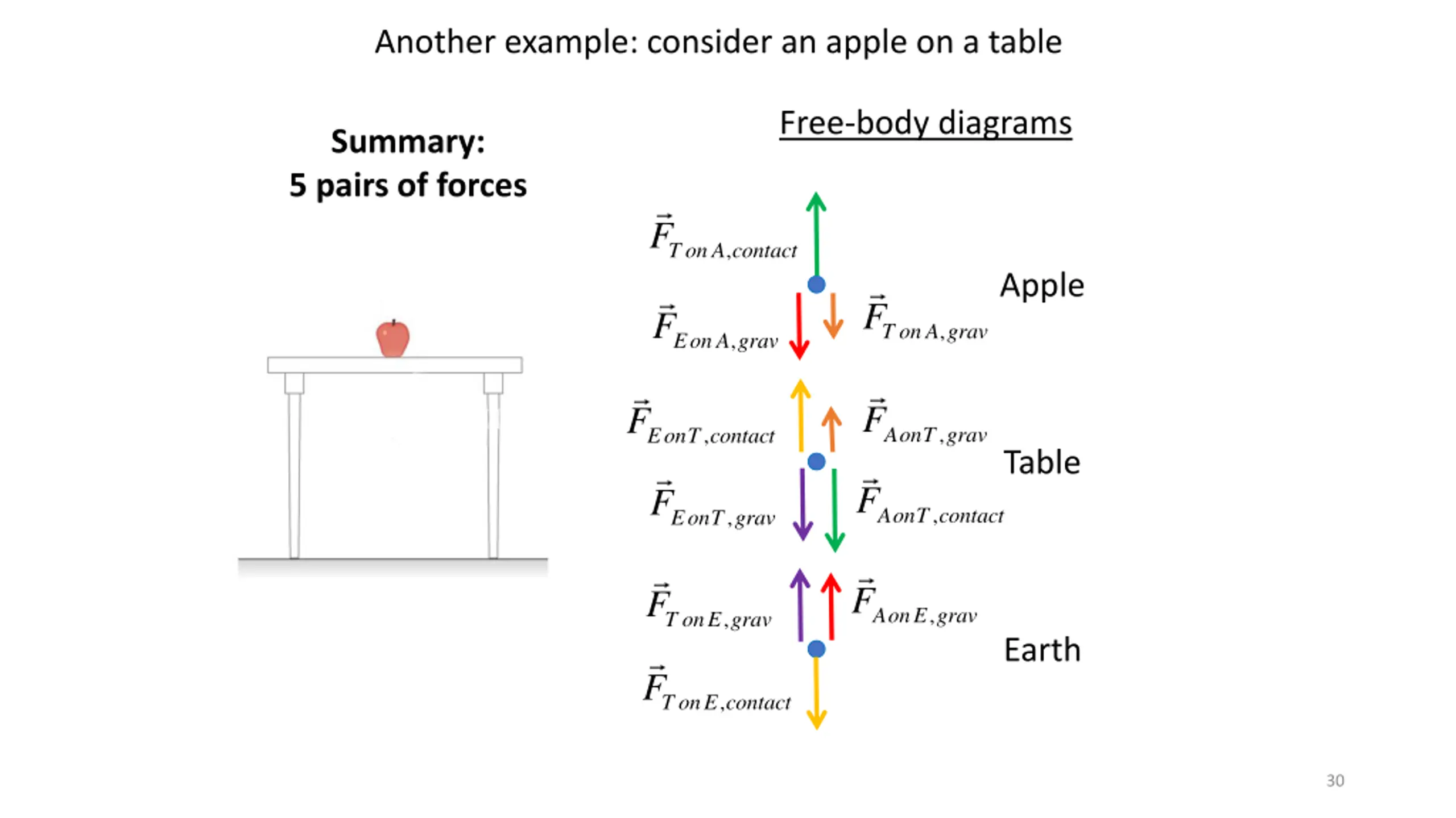 Another example: consider an apple on a table Free-body diagrams Summary: 5 pairs of forces T onA contact F , Apple T onA grav F EonA grav F , , AonT grav F EonT contact F , , Table AonT contact F EonT grav F , , AonE grav F T onE grav F , , Earth T onE contact F , 30