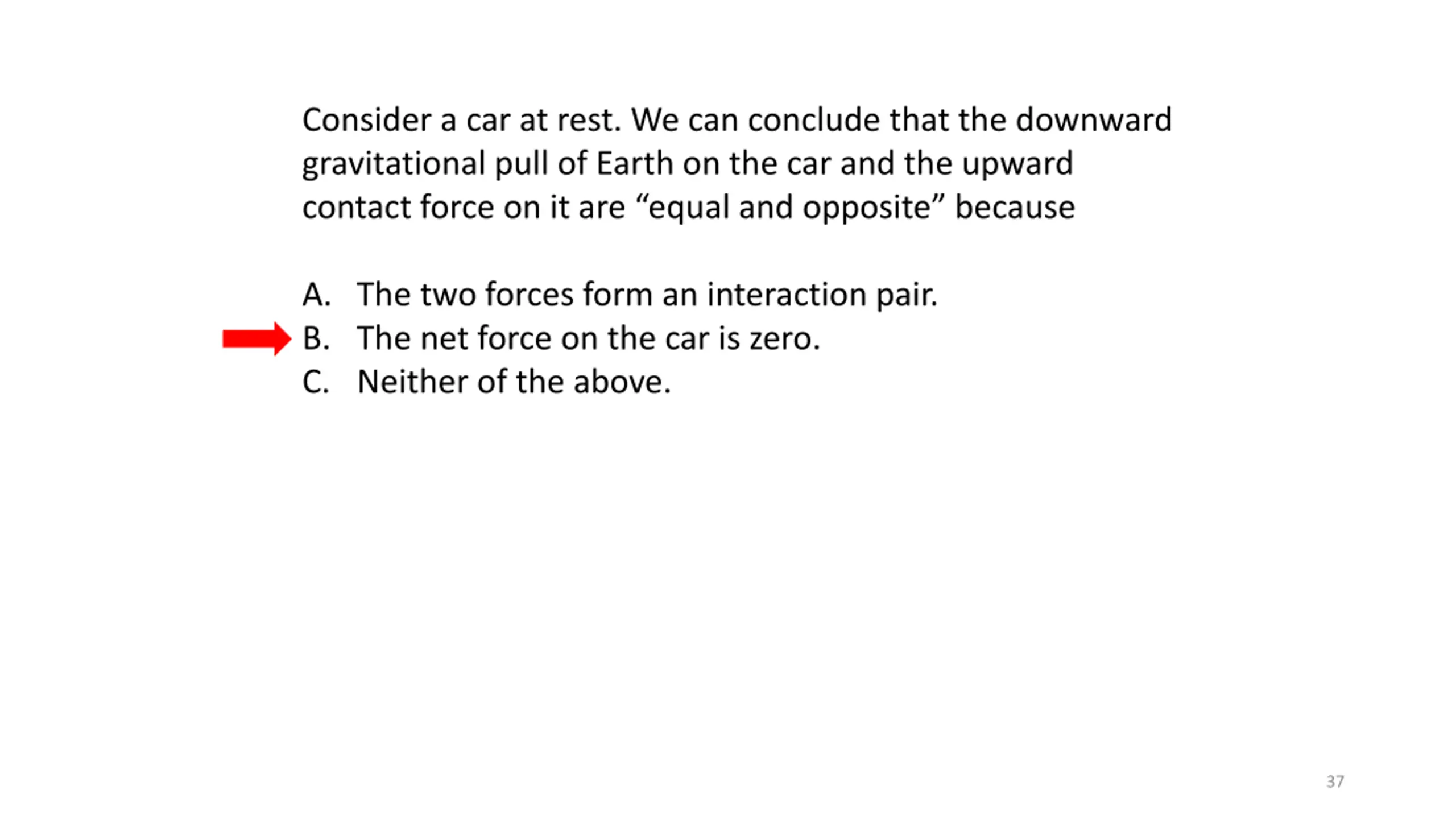 Consider a car at rest. We can conclude that the downward gravitational pull of Earth on the car and the upward contact force on it are equal and opposite because A. The two forces form an interaction pair. B. The net force on the car is zero. C. Neither of the above. 37