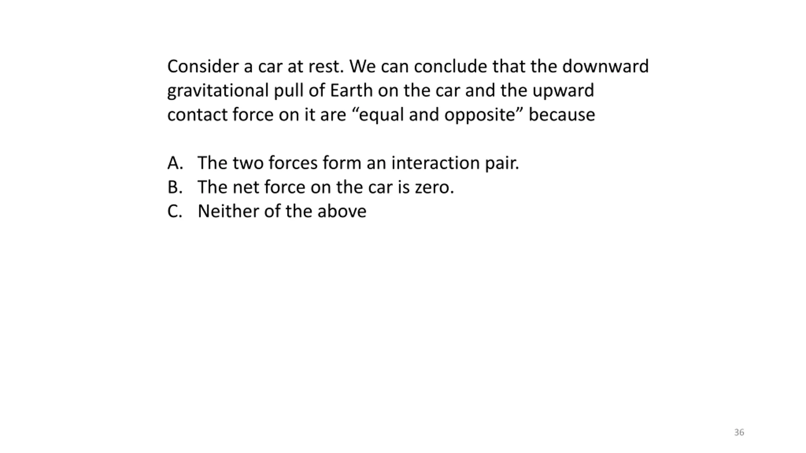 Consider a car at rest. We can conclude that the downward gravitational pull of Earth on the car and the upward contact force on it are equal and opposite because A. The two forces form an interaction pair. B. The net force on the car is zero. C. Neither of the above 36