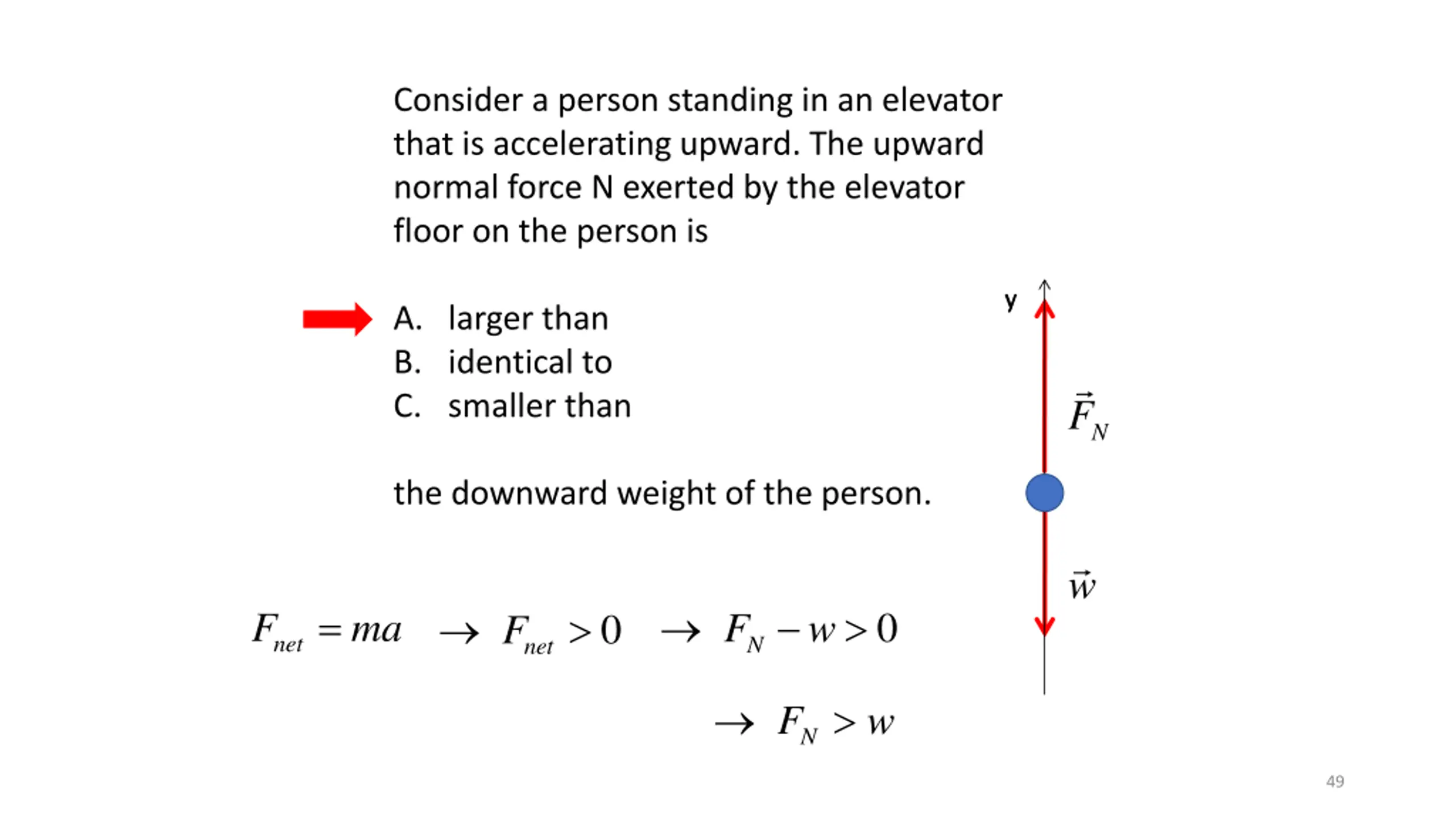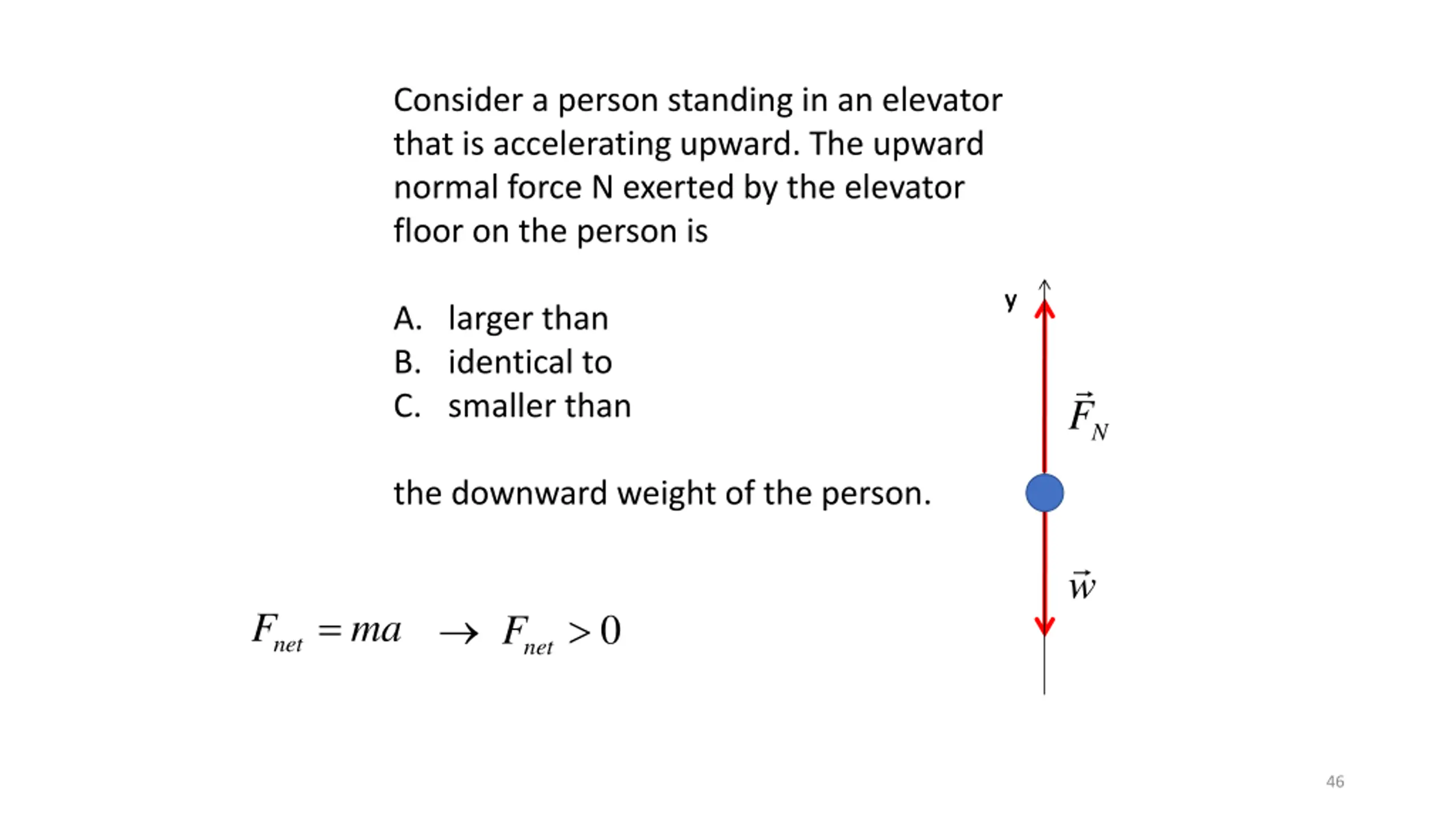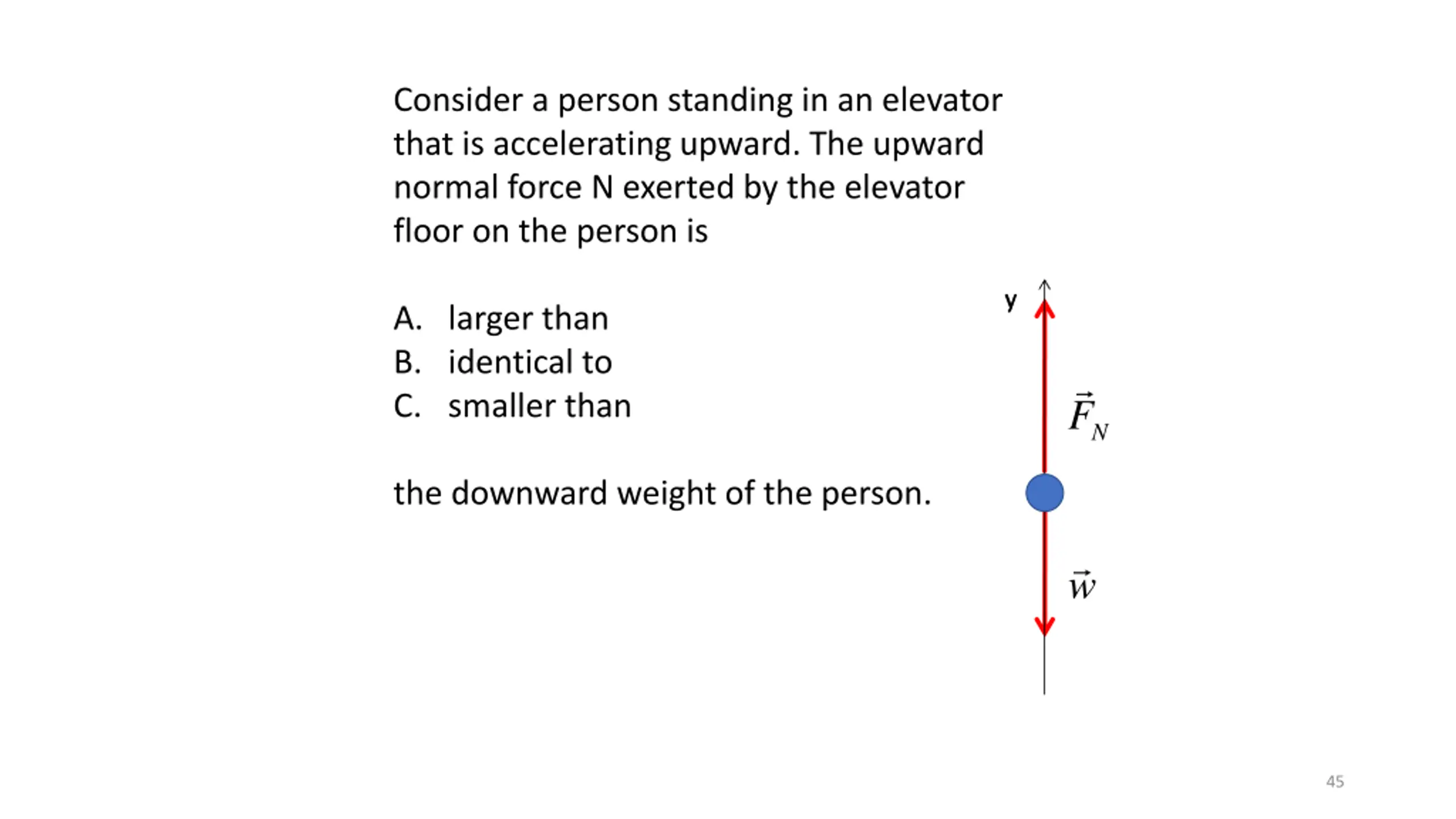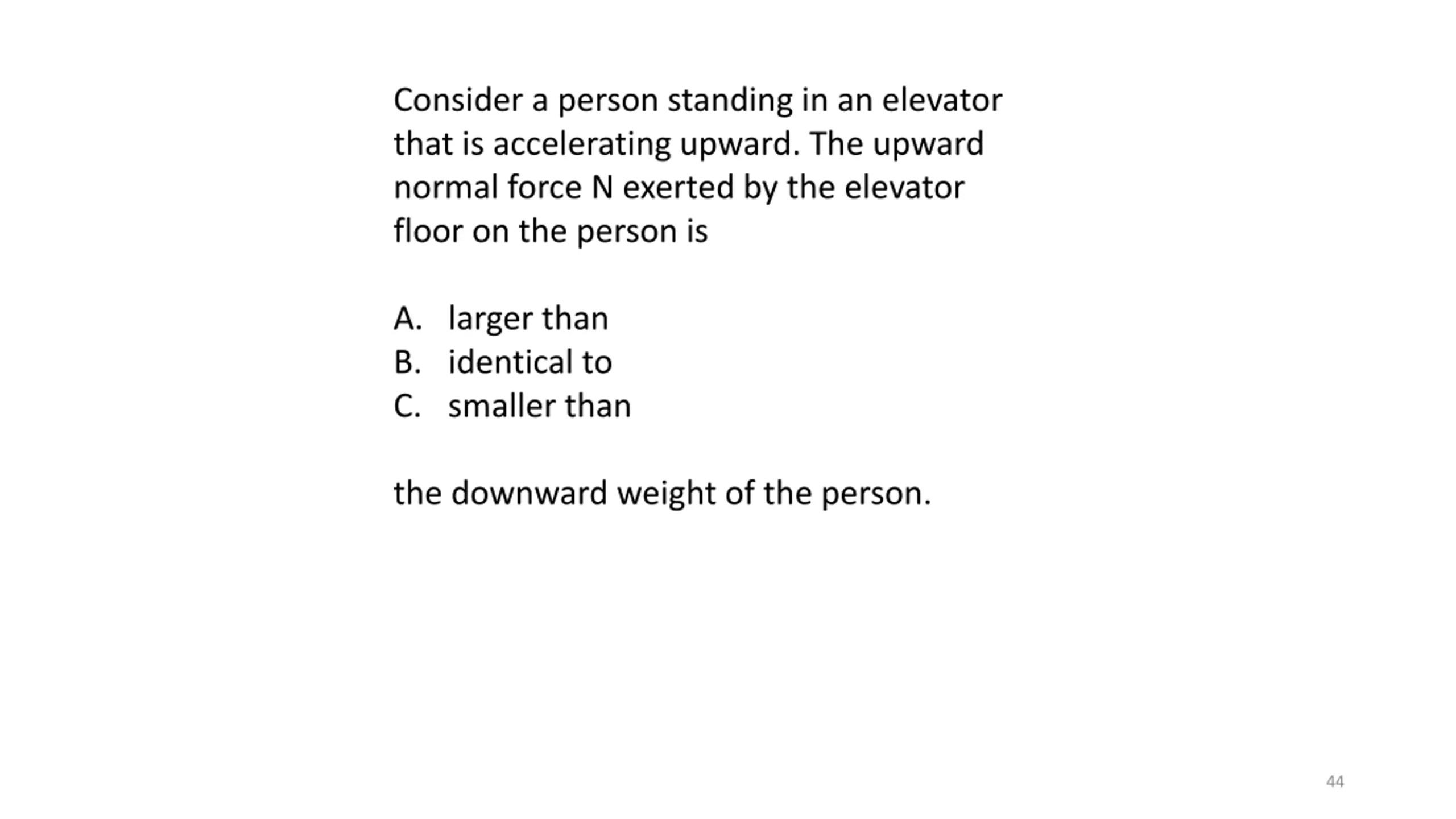 Consider a person standing in an elevator that is accelerating upward. The upward normal force N exerted by the elevator floor on the person is A. larger than B. identical to C. smaller than the downward weight of the person. 44