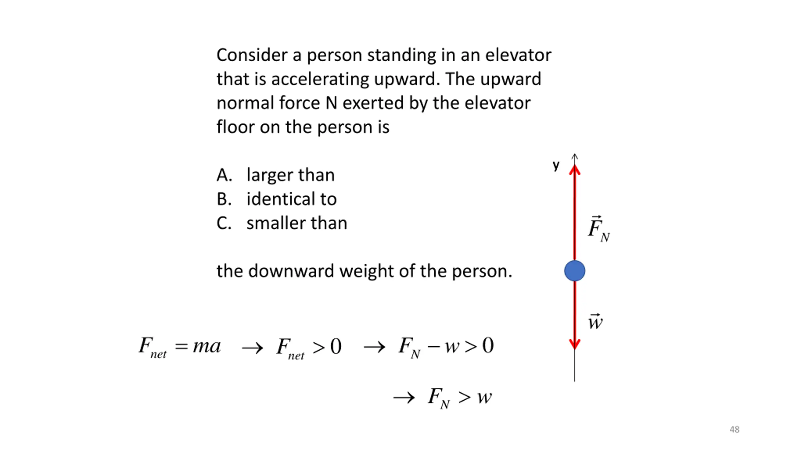 Consider a person standing in an elevator that is accelerating upward. The upward normal force N exerted by the elevator floor on the person is y A. larger than B. identical to C. smaller than F net the downward weight of the person. = F ma 0 F net net 47