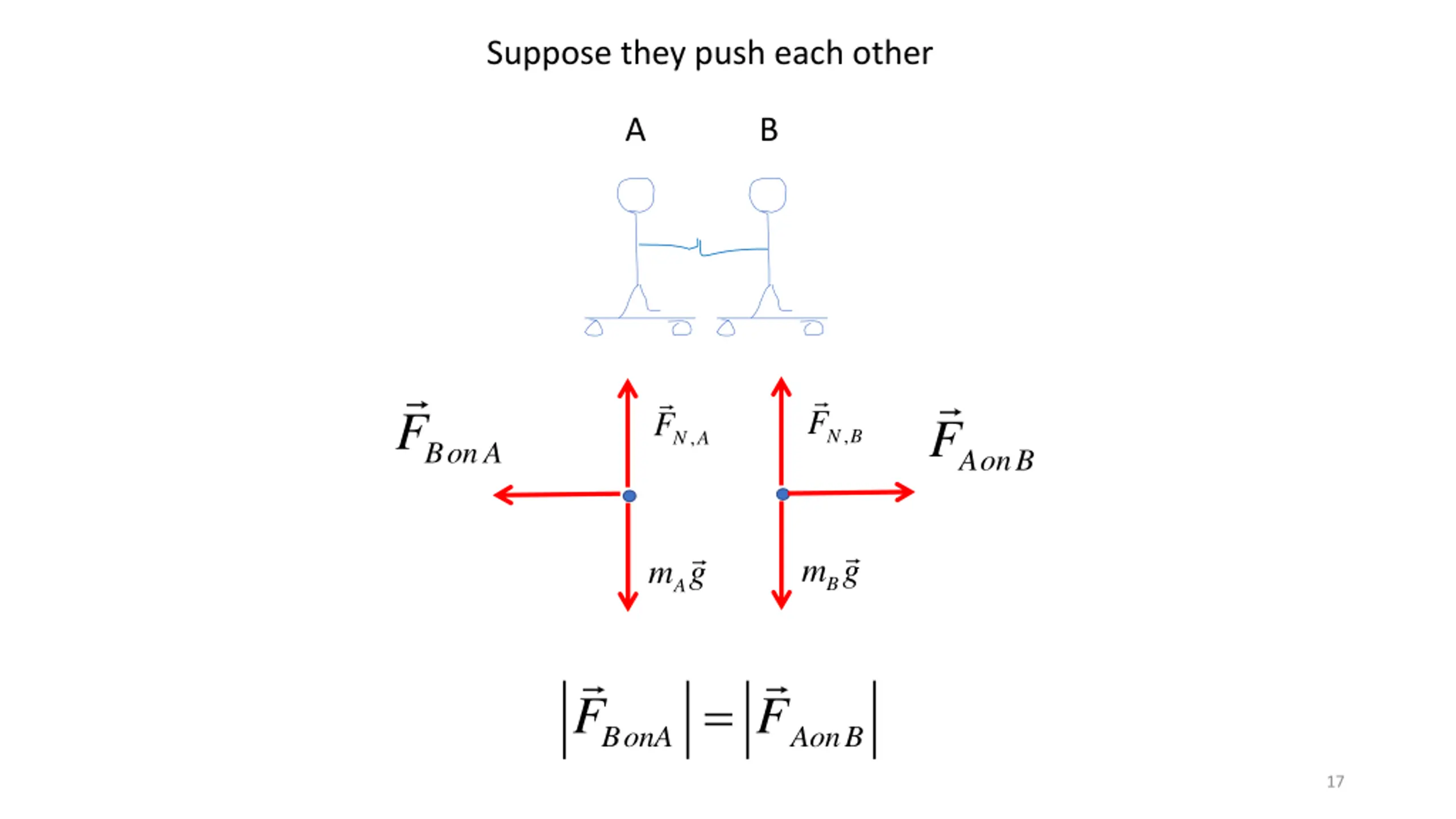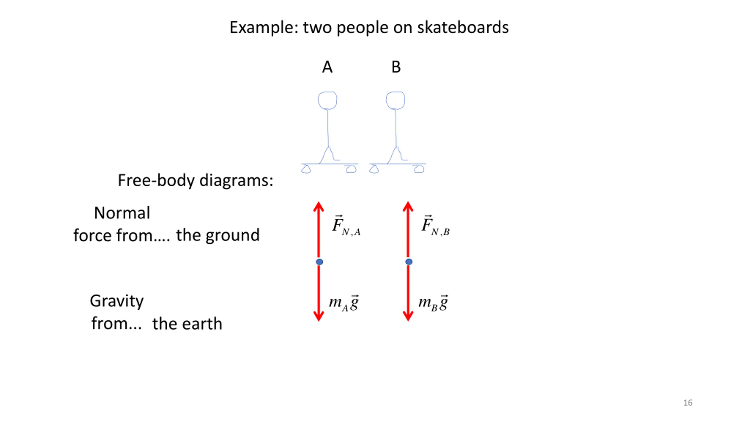 Example: two people on skateboards A B Free-body diagrams: Normal force from . F F , , N B N A the ground m g m g Gravity from... B A the earth 16