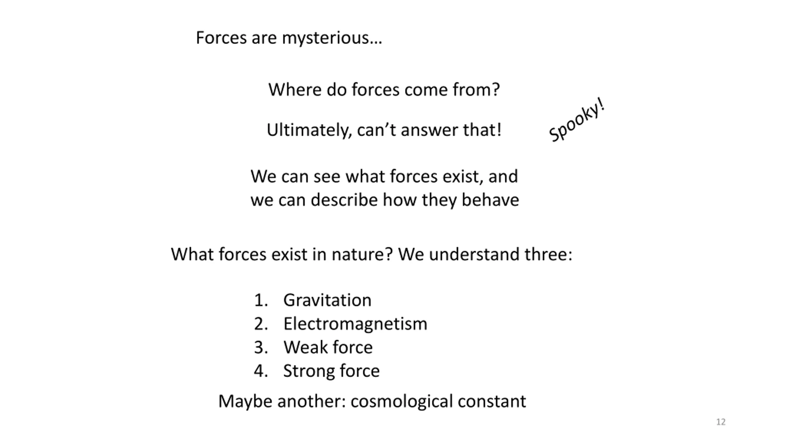 Forces are mysterious Where do forces come from? Ultimately, can t answer that! We can see what forces exist, and we can describe how they behave What forces exist in nature? We understand three: 1. Gravitation 2. Electromagnetism 3. Weak force 4. Strong force Maybe another: cosmological constant 12
