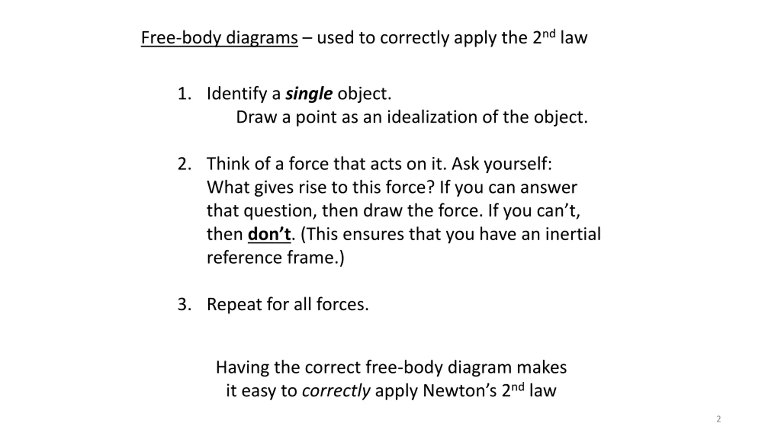Free-body diagrams used to correctly apply the 2nd law 1. Identify a single object. Draw a point as an idealization of the object. 2. Think of a force that acts on it. Ask yourself: What gives rise to this force? If you can answer that question, then draw the force. If you can t, then don t. (This ensures that you have an inertial reference frame.) 3. Repeat for all forces. Having the correct free-body diagram makes it easy to correctlyapply Newton s 2nd law 2