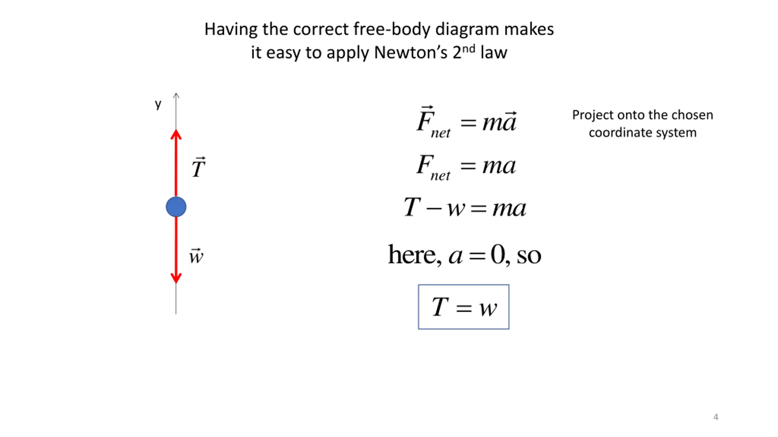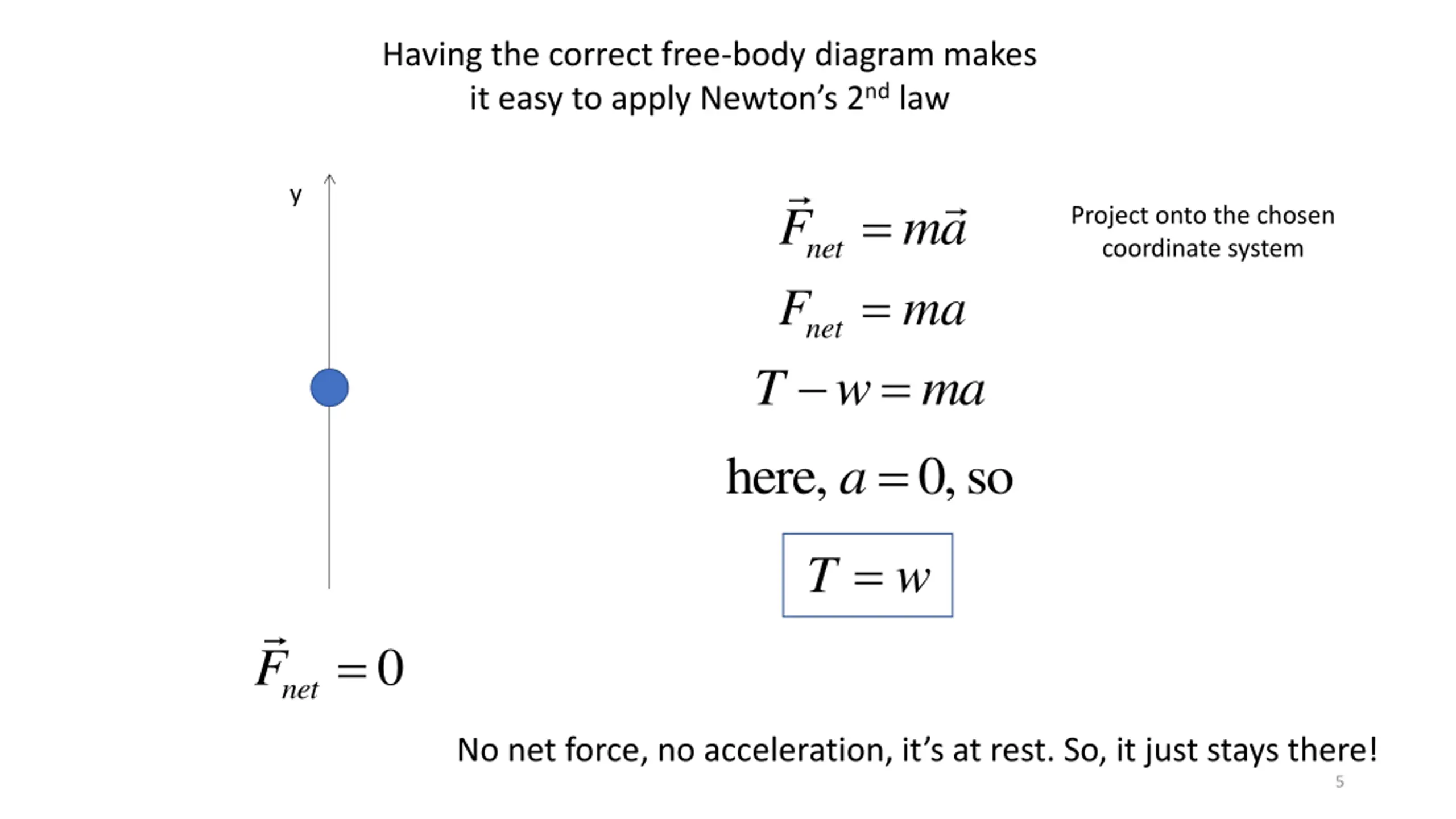 Having the correct free-body diagram makes it easy to apply Newton s 2nd law y = = F F ma ma ma = a= Project onto the chosen coordinate system net net T w here, 0,so = T w = 0 F net No net force, no acceleration, it s at rest. So, it just stays there! 5