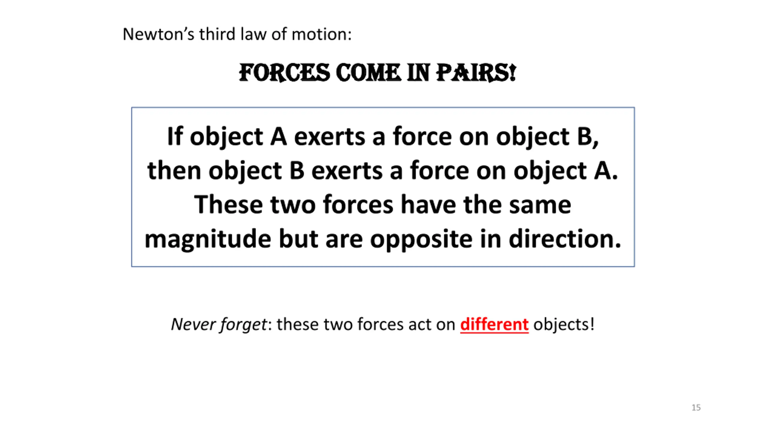 Newtons third law of motion: Forces come in pairs! Forces come in pairs! If object A exerts a force on object B, then object B exerts a force on object A. These two forces have the same magnitude but are opposite in direction. Never forget: these two forces act on different objects! 15