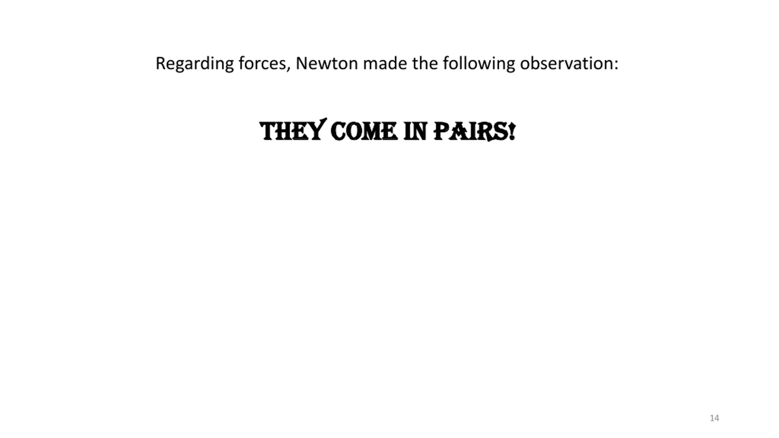 Regarding forces, Newton made the following observation: They come in pairs! They come in pairs! 14