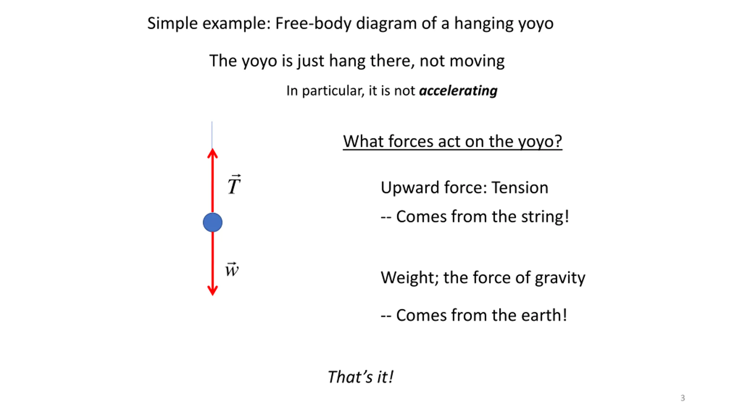 Simple example: Free-body diagram of a hanging yoyo The yoyo is just hang there, not moving In particular, it is not accelerating What forces act on the yoyo? T Upward force: Tension -- Comes from the string! w Weight; the force of gravity -- Comes from the earth! That s it! 3