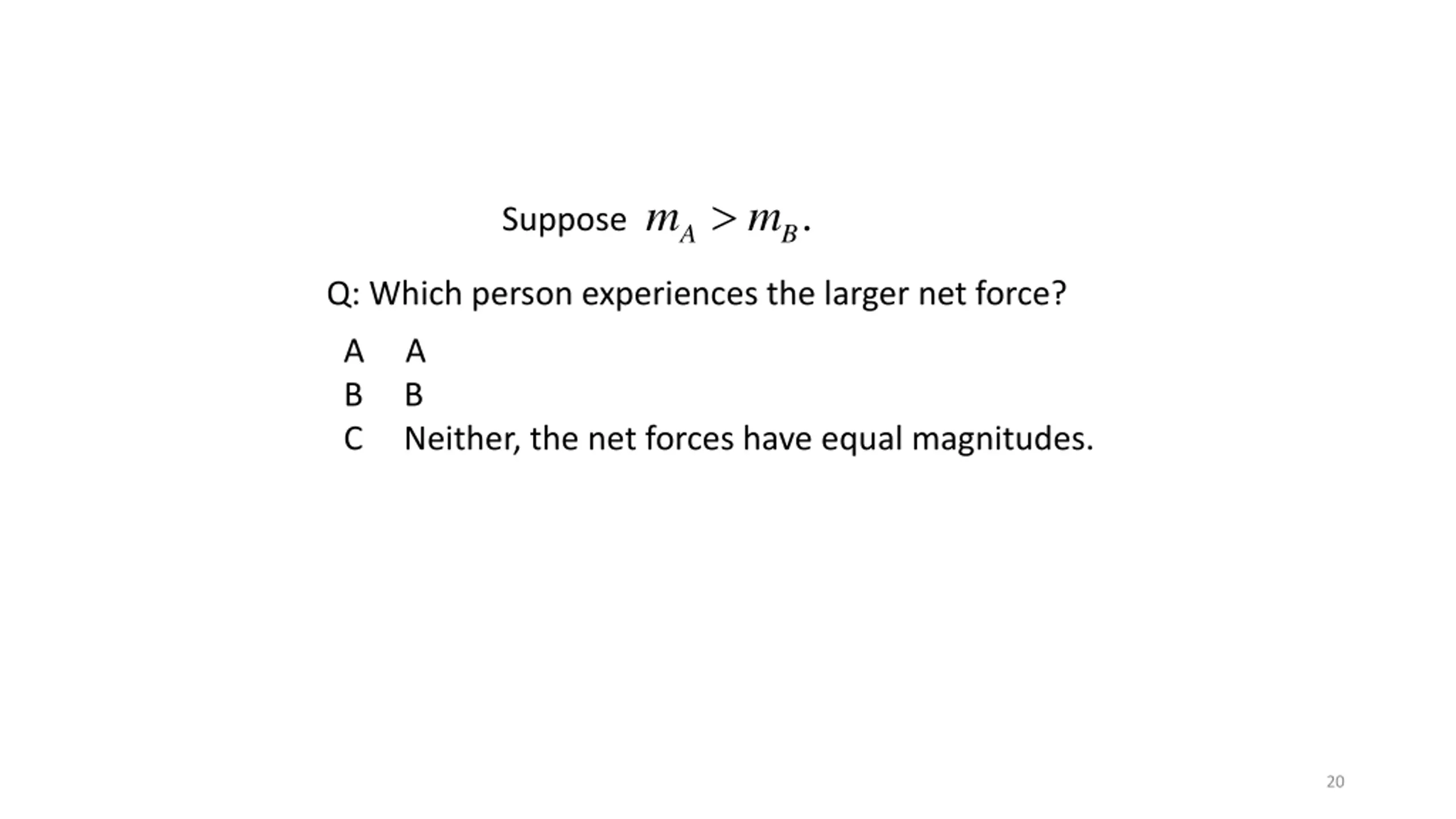 . m m Suppose A B Q: Which person experiences the larger net force? A A B B C Neither, the net forces have equal magnitudes. 20