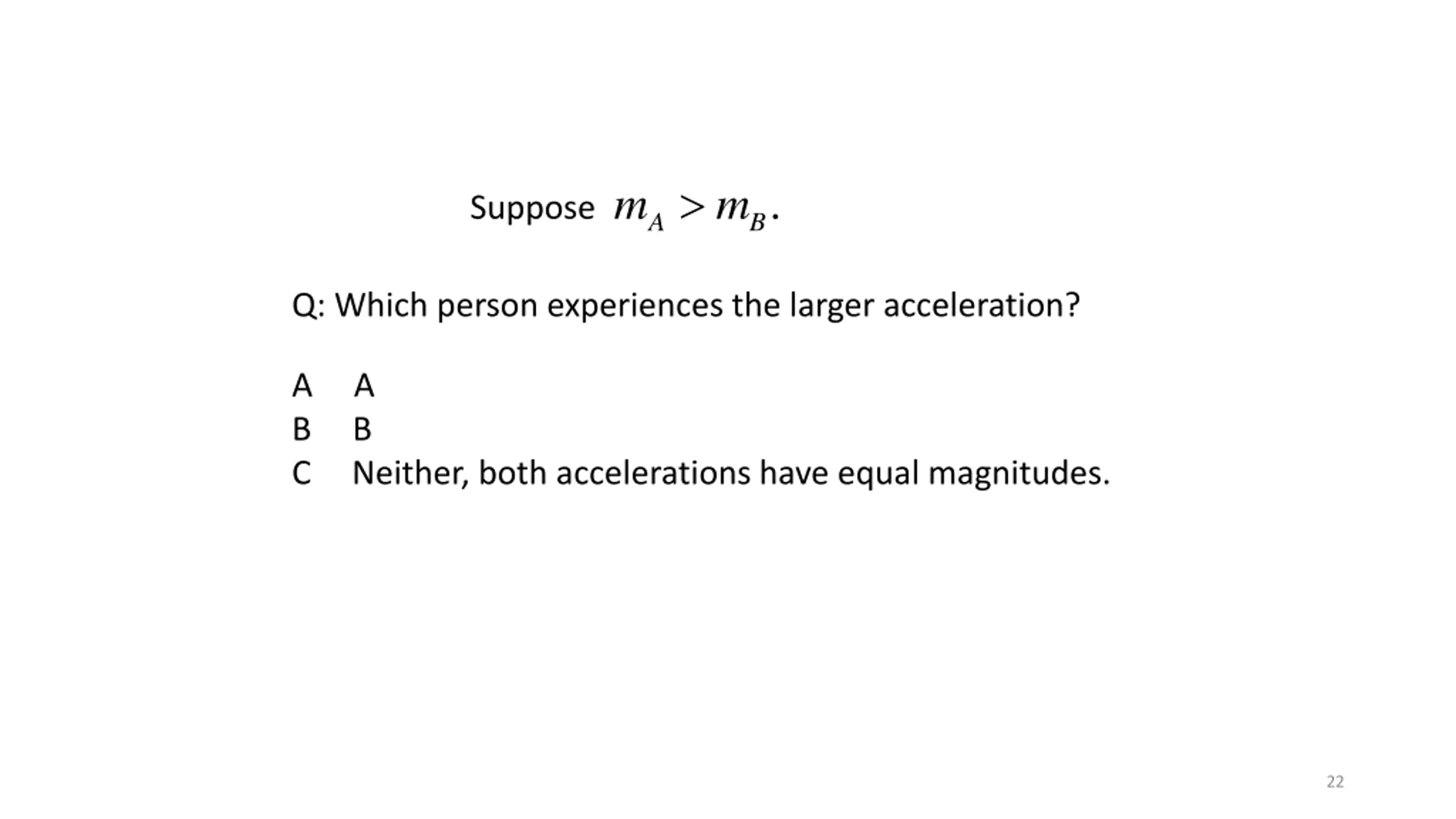 . m m Suppose A B Q: Which person experiences the larger net force? A A B B C Neither, the net forces have equal magnitudes. 21