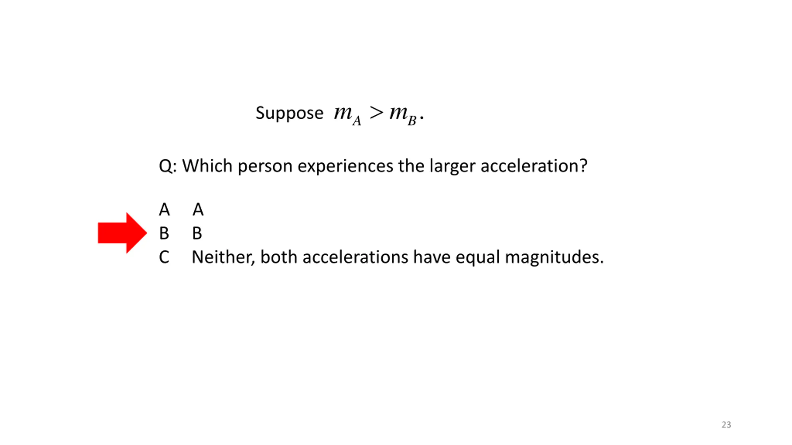 . m m Suppose A B Q: Which person experiences the larger acceleration? A A B B C Neither, both accelerations have equal magnitudes. 22